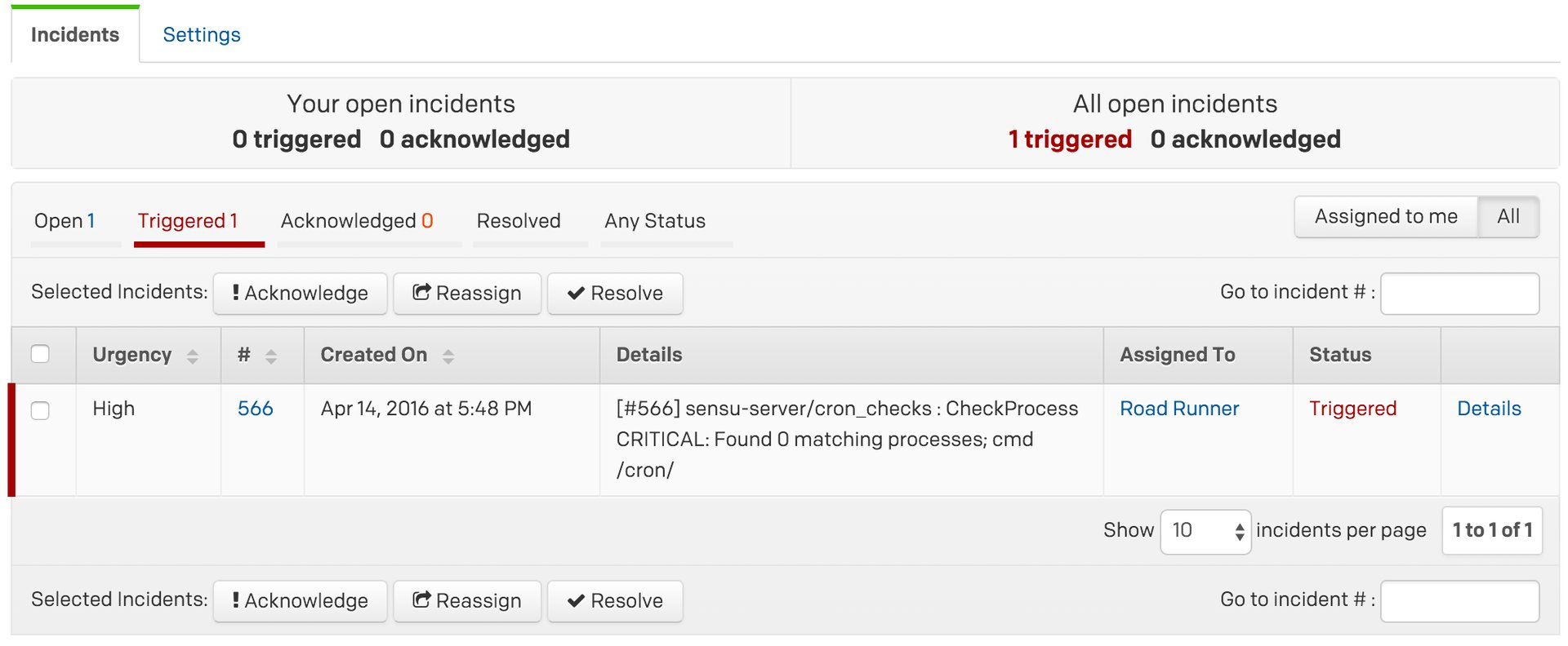 service cron stop - Within 60 seconds you should see an alert in Sensu and a new incident triggered in PagerDuty: