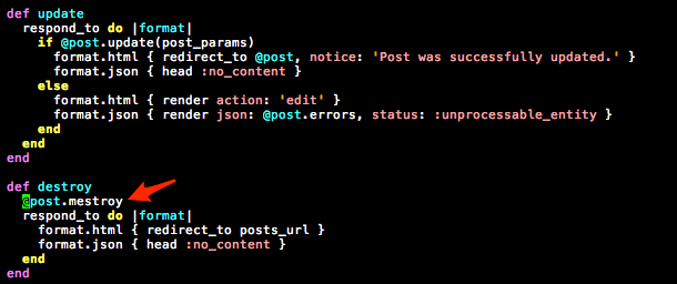 post.destroyto the undefined methodpost.mestroy. I then committed the error to git, pushed it to Heroku, visited my site and clicked Destroy next to a post on the Posts index page.