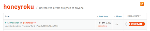 - Introduce an error inside your application. In this case, I changed the working Activerecord method