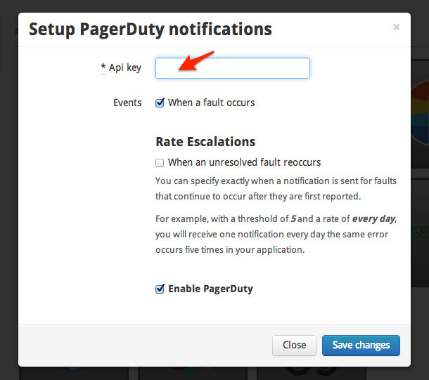 - Enter the Integration Key you copied from PagerDuty in the API key field and click Save changes.
