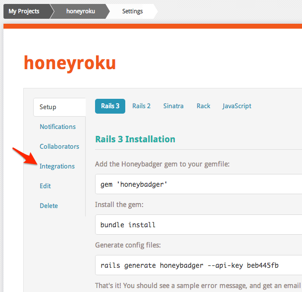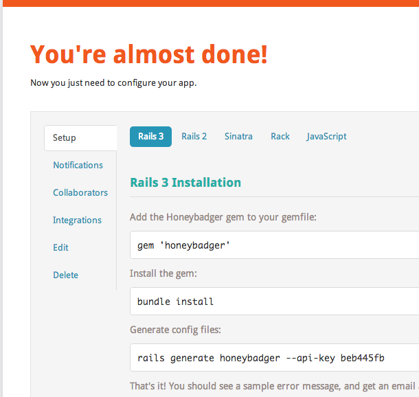 rails generate honeybadger --api-key [your_key]you should see a confirmation within your environment.
