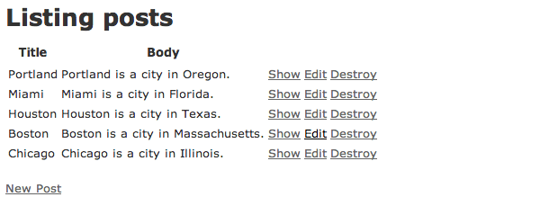 rails generate honeyroku Post title:string body:textand deployed it to Heroku.