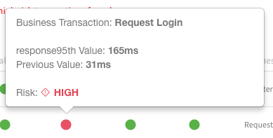 In the above image, you can see that Harness flagged two business transaction performance regressions post-deployment. Tied to that, the below image shows that one transaction—“Request Login”—actually increased from 31ms to 165ms in response time. All of this analysis is automated with AI/ML.