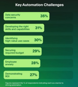 You should start running your operations on AI and automation today. But we’d be remiss if we didn’t also highlight the challenges to AI and automation. Successful implementation requires addressing security concerns, developing skills, identifying high-value use cases, and managing change—all while maintaining compliance and building trust. Organizations face a clear set of challenges when adopting AI and automation in their operations, with recent data highlighting the primary concerns.