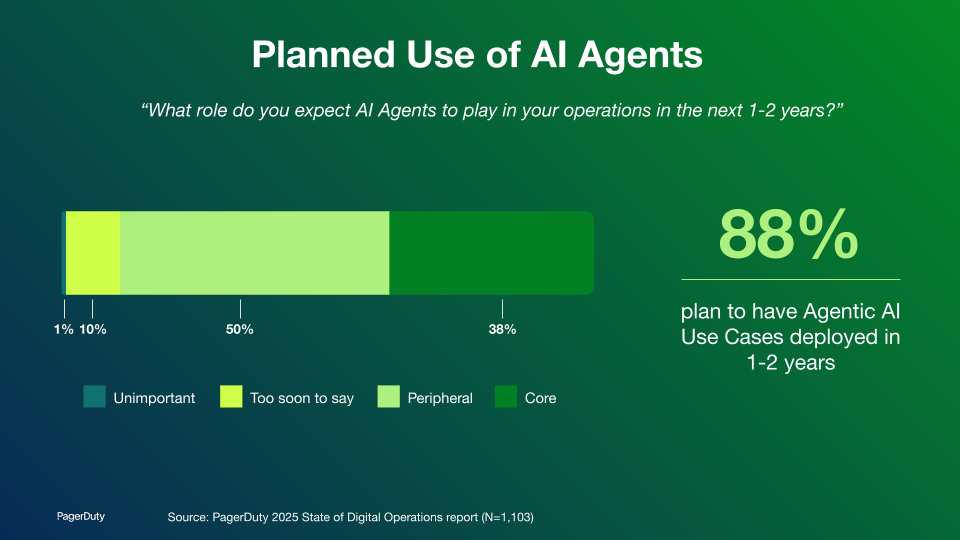 According to the PagerDuty 2025 State of Digital Operations report, 38% of leaders expect AI agents to be core to their operations within 1-2 years, and 88% expect usage to be either core or peripheral.