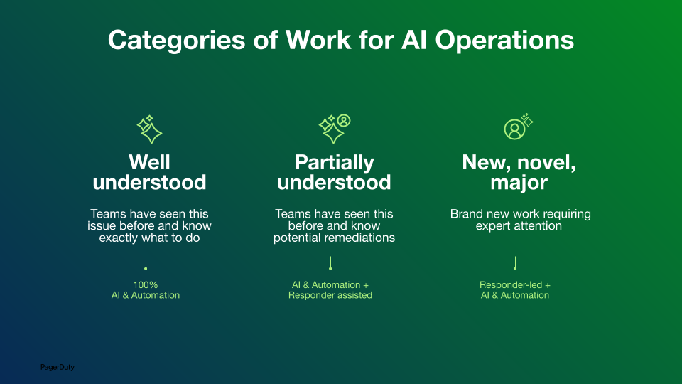 AI Operations refers to how AI agents will work within the incident lifecycle. Instead of letting agents loose on every issue, we use a three-tier framework to help organizations understand what can be automated and where humans remain essential.
