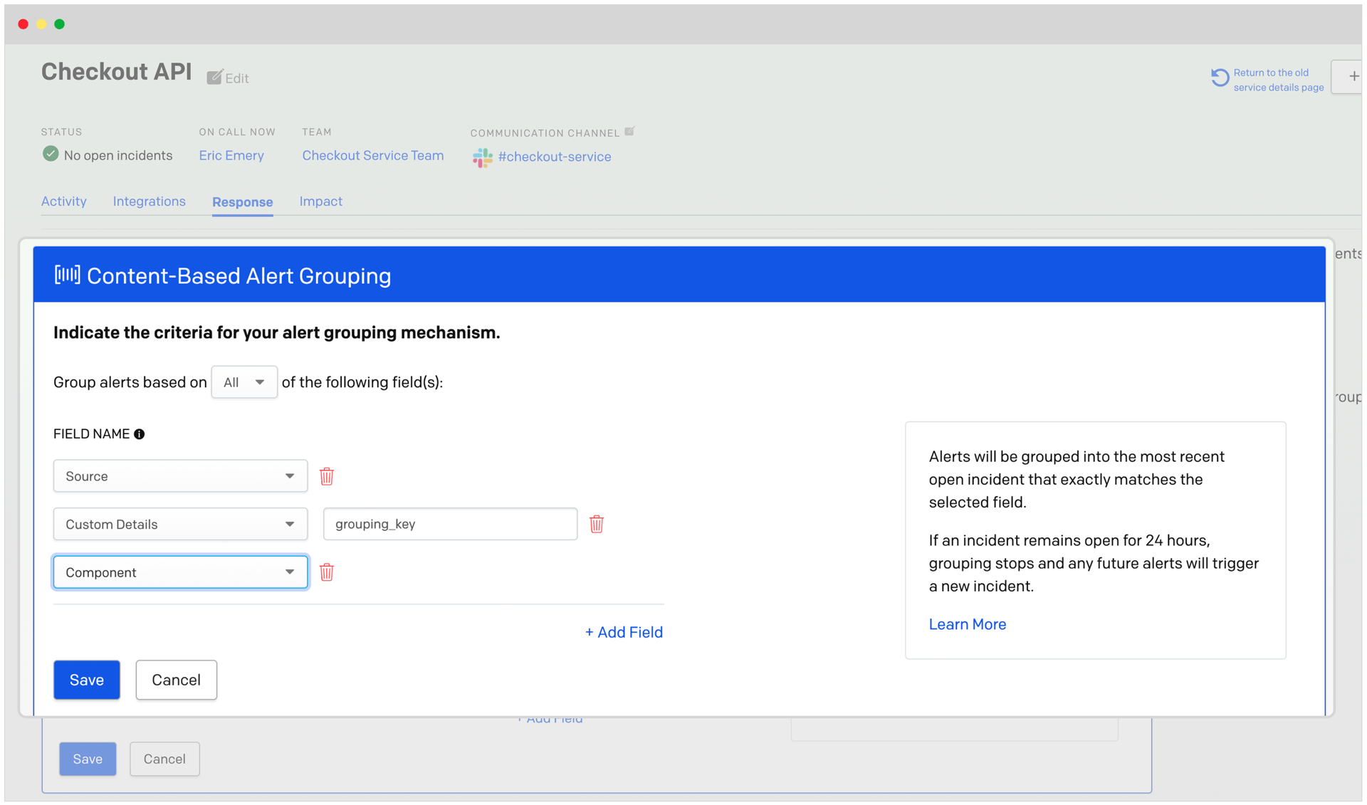 You can have complete control over how alerts get grouped with Content-Based Alert Grouping. When we launched this feature, we gave you the ability to group alerts based on an exact match of a defined field. Now you have the ability to group alerts based on multiple fields using logic like “for all” or “for any” so that any alerts that match this criteria will automatically be grouped together.