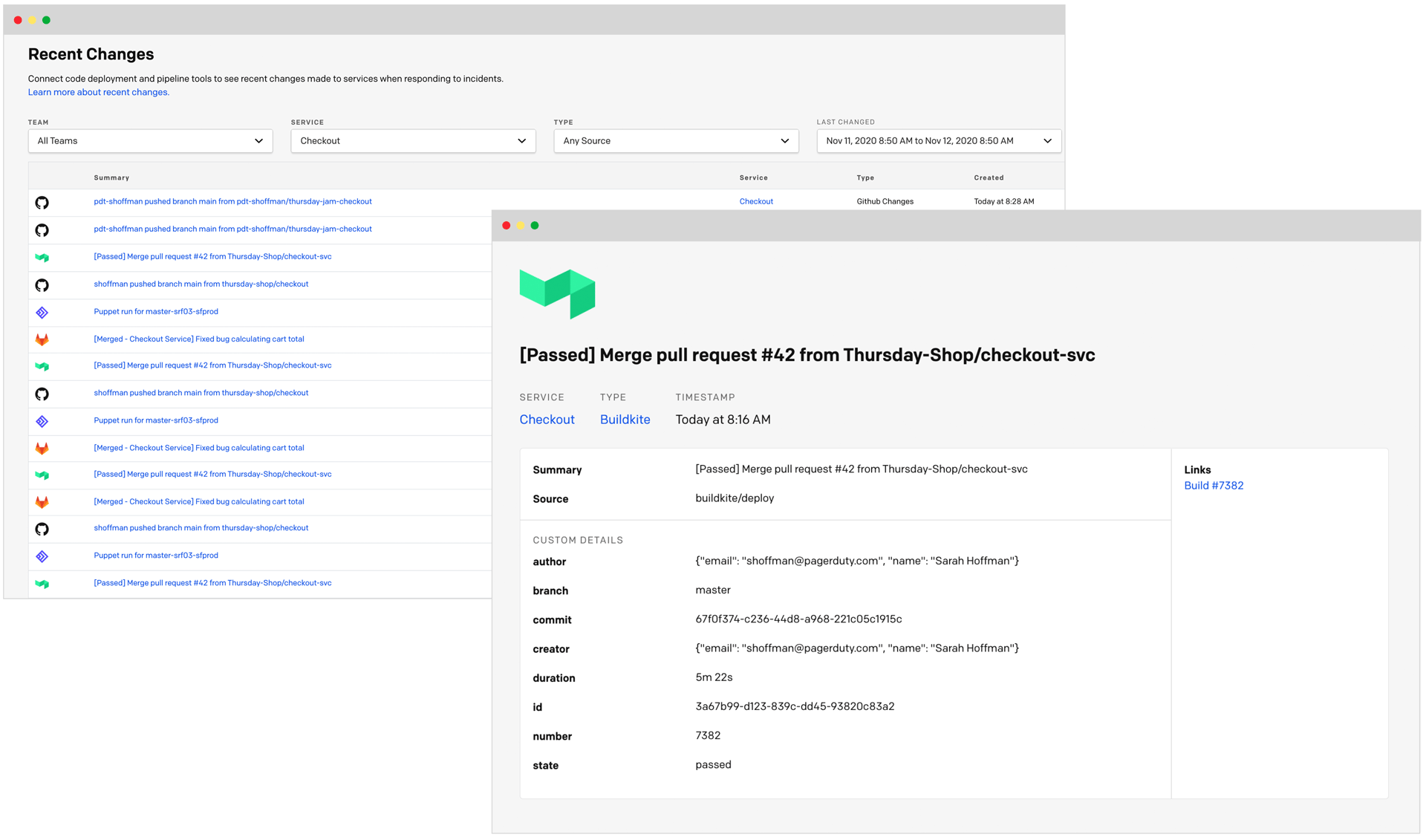 Industry research has shown that the majority of incidents result from some kind of change. Thus, PagerDuty’s ability to natively process these events and relate them to incidents in flight helps you immediately identify where changes have caused failures. PagerDuty also helps you predict what risk future changes could have across critical business services.