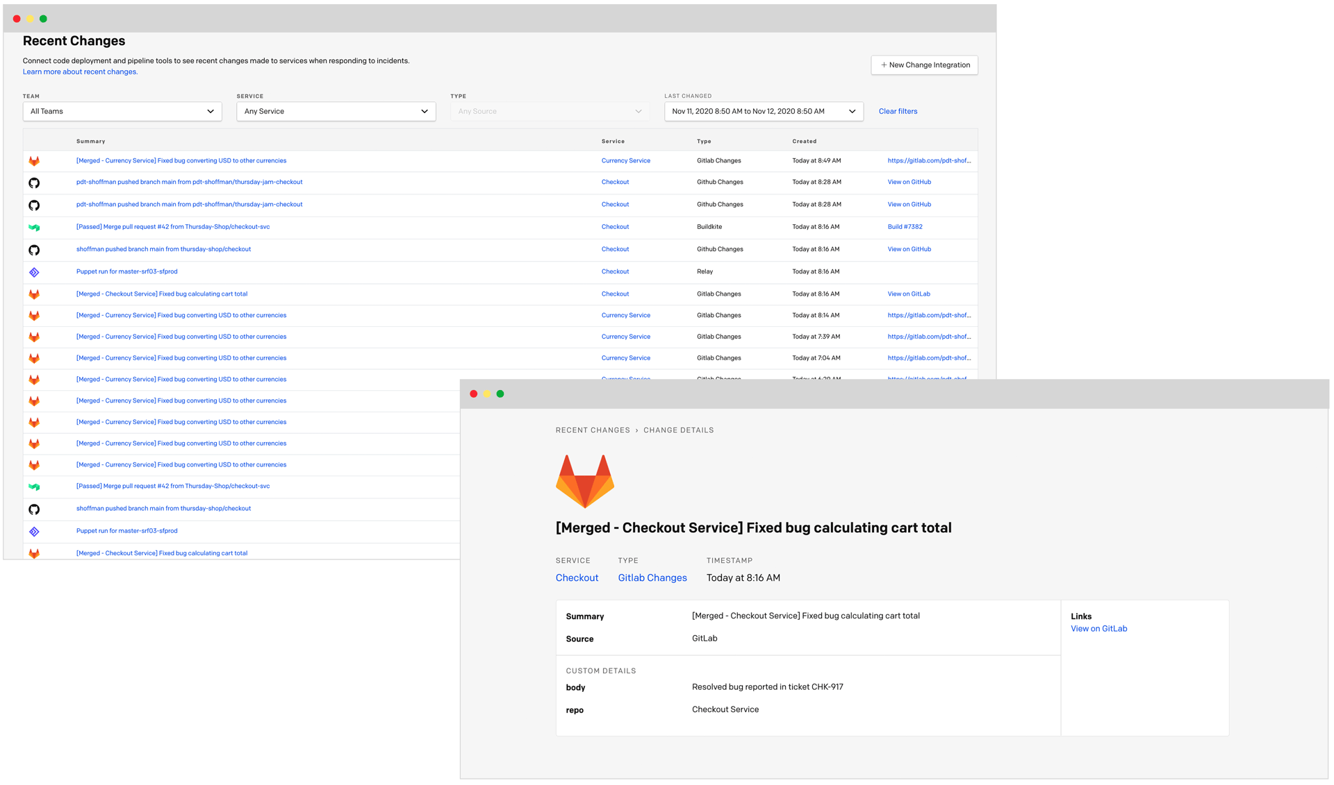 To get started with change impact mapping, start sending change events to PagerDuty using any of these integrations or GitHub and Relay by Puppet, as previously announced. You can also send your own events to us through the Change Events API. Navigate to Incidents > Recent Changes from the top navigation in your PagerDuty account, or learn more about it here.