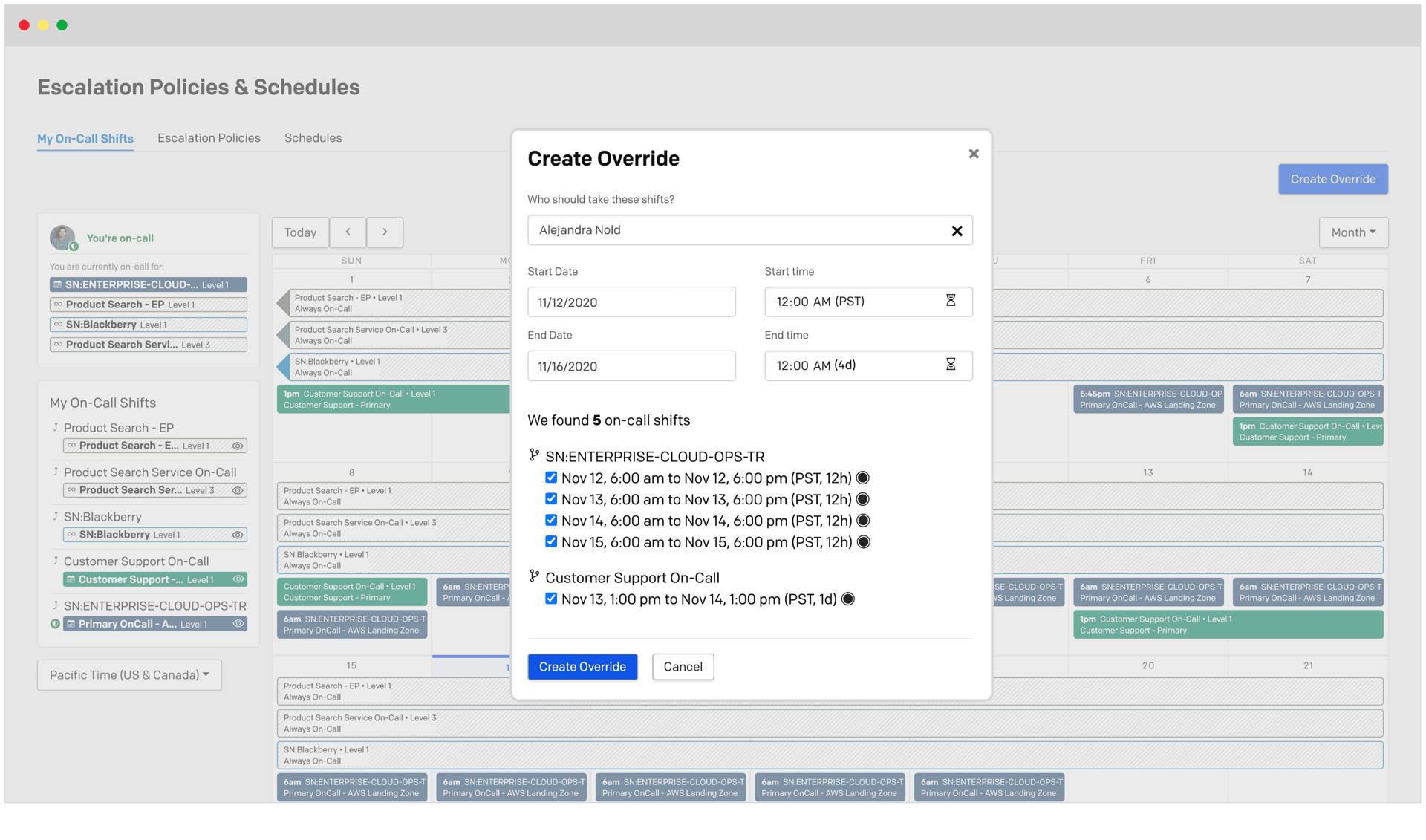 PagerDuty on-call users can now create overrides across multiple shifts, schedules, and escalation policies at once. This is particularly useful when managing multi-day unavailability, like Paid Time Off, and ensures no shifts are missed by reducing the chance of error that arises when modifying shifts one at a time. Multiple Override Creation is now generally available.
