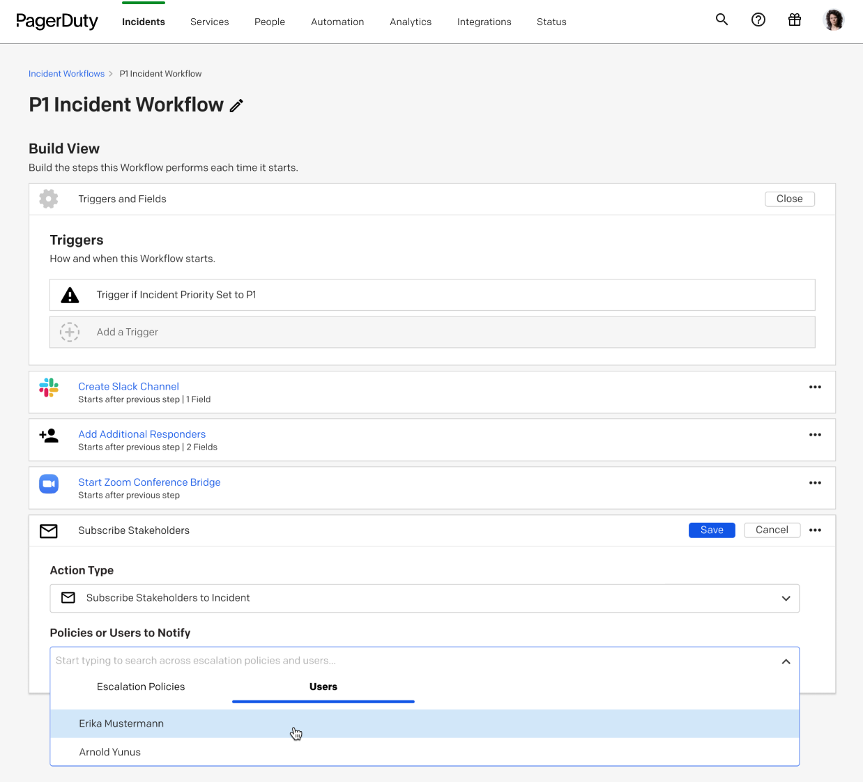 Incident Workflows: First, we’re excited to share that PagerDuty is integrating the powerful Catalytic workflow engine to support customizable Incident Workflows. With Incident Workflows, you define the workflow logic to configure a sequence of common incident actions—such as adding a responder, subscribing stakeholders, or starting a conference bridge—into an orchestrated response. These workflows run automatically, triggered by common events like a change in priority. Learn more in this summary of what’s new in PagerDuty Incident Response.