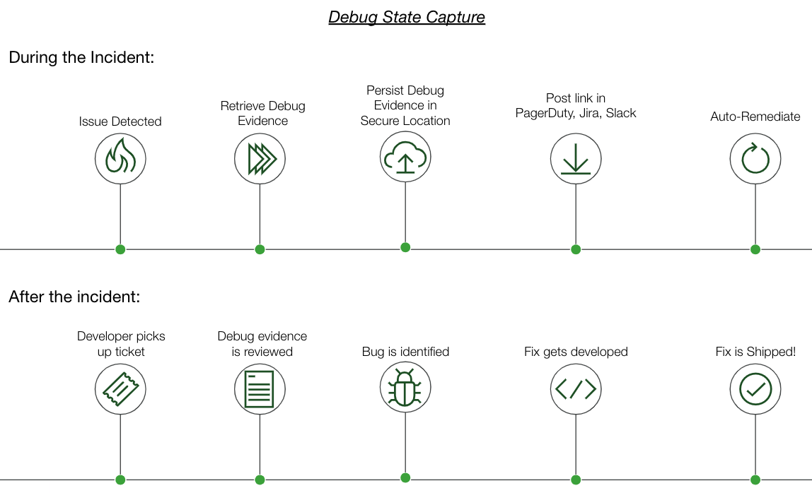 But wait—isn’t that what monitoring tools are for? The answer is: sometimes. Depending on the issue, configuration or code-level errors can be tracked down using sophisticated observability tools. However, developers often need even more granular data that isn’t captured by monitoring tools—simply because this debug-level data isn’t needed for alerting or service restoration. Data such as heap, thread, and TCP-dumps, top resource-consuming database queries, and stack traces are used to identify the “true culprit,” but most often are not needed to restore-service. Gathering this data takes time, and we all know that, during an incident, restoring service availability takes precedence over everything else.