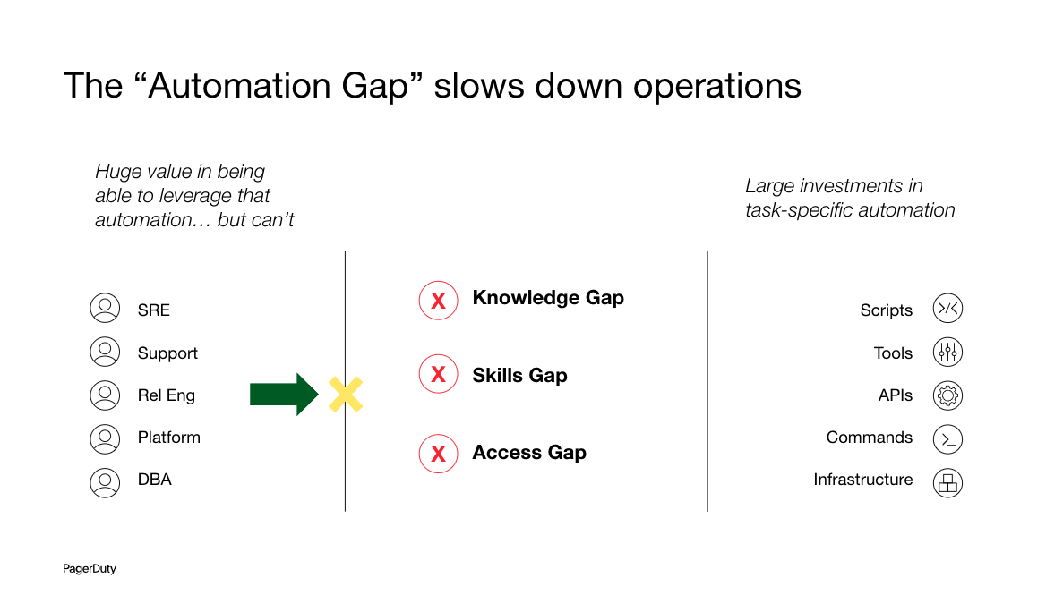 The automation gap is a scenario where the use of automation within an organization exists in islands—with each specialized operational unit leveraging pockets of automation in silos. Additionally, the existence of an automation gap means most employees (besides the subject matter experts) either lack the tribal knowledge, skill sets, and/or access privileges across the organization to actually use it.