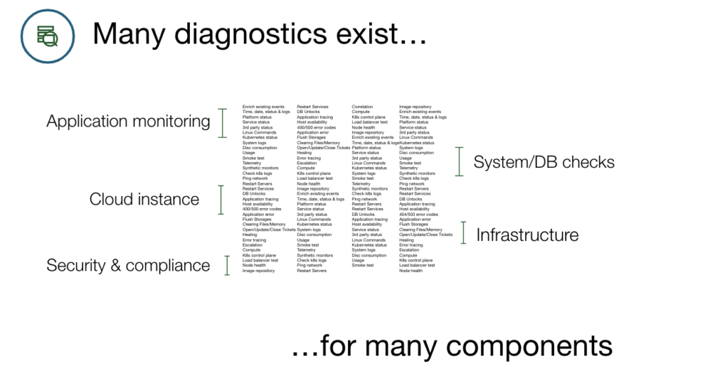 These diagnostic steps often remain static—for the most part—depending on the component you’re working with, no matter the priority of the incident that occurs. Automated diagnostics can be applicable to heterogeneous incidents; it doesn’t have to be purpose-built for the same, recurring incident, it can be applied to and customized around all sorts of common incident types and severities—specific to your environment—for almost any common component. Think of it like going to the doctor’s office. Whether you are going to urgent care for a specific complaint or just an annual checkup, they still take your temperature, blood pressure, and weight when you walk in.