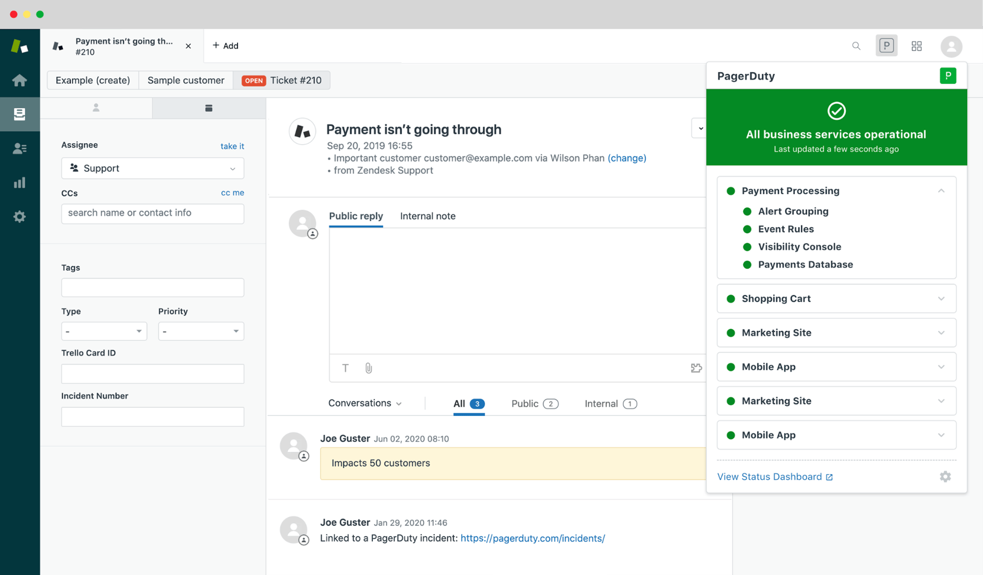 PagerDuty for Customer Service + Zendesk enables real-time response, better cross-team collaboration, and proactive customer communications. With fully bi-directional communications, we are connecting people, operations, and data in real time to solve issues faster. The Status Dashboard further deepens the integration with Zendesk by delivering visibility and real-time status updates directly to customer service agents within the Zendesk tool suite.