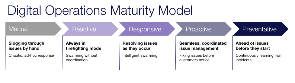 For those of you who might be newer to operational maturity, customers often ask us what ‘good’ looks like to help organizations measure their operational maturity, we developed the Digital Operations Maturity Model. The model gives organizations a way to define operational maturity, learn how to identify where they fall on the spectrum, and understand where to focus their efforts to improve.