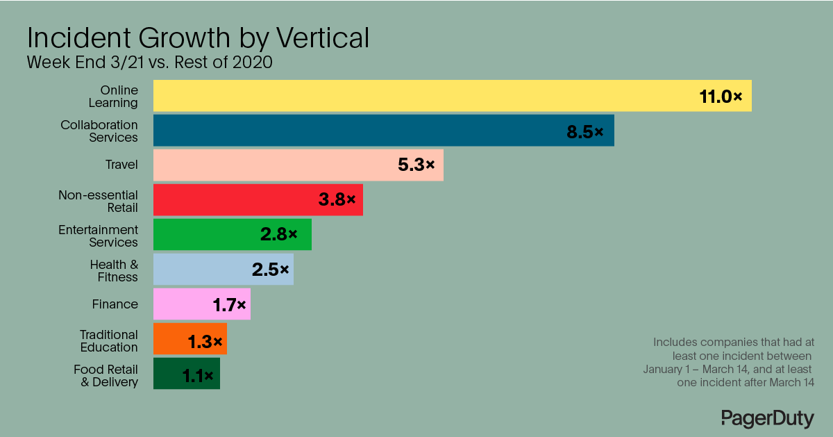- Many organizations are under significant stress. Companies in certain verticals are experiencing up to 11x the number of incidents, meaning their teams are likely in crisis mode, handling a huge increase in workload, and constantly taking action to prevent service interruptions. Highly stressed verticals include online learning platforms, collaboration services, travel, non-essential retail, and entertainment services.