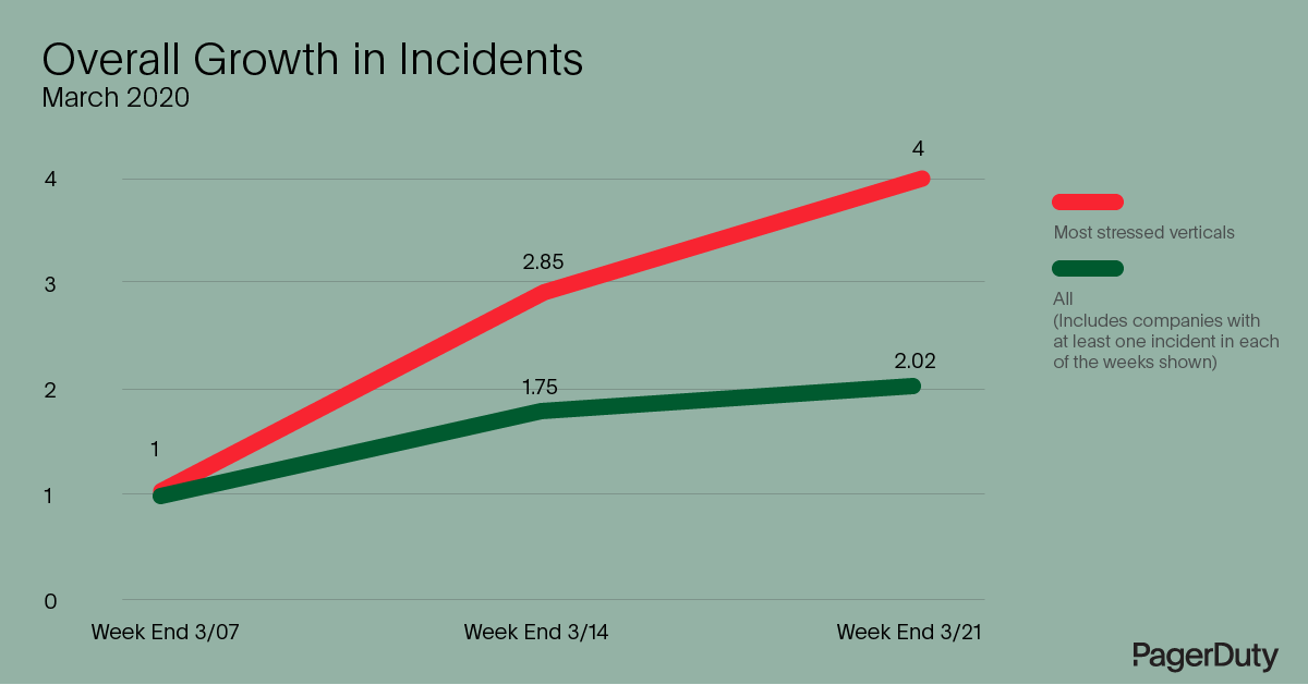 - Organizations across the board are under increased stress. Outside of the above group, all companies on the PagerDuty platform are experiencing, on average, double the number of incidents, demonstrating that online demand is up in general.