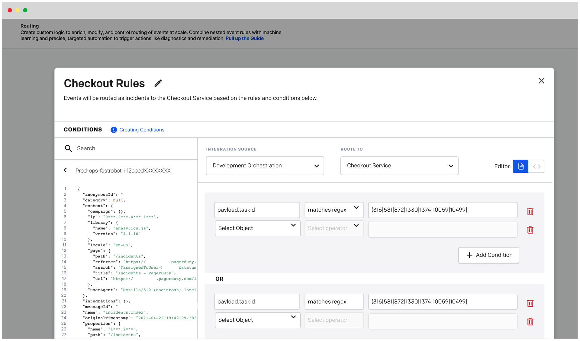 • Customers have been asking us to let them do more with our event rules, and the team has been hard at work to make this happen. Our new Event Orchestration feature cuts down on manual event processing with a powerful decision engine, where teams can create custom logic to enrich, modify, and control routing based on event conditions at scale. By combining nested event rules with machine learning and precise, targeted automation to trigger actions like diagnostics and remediation, users can boost operational efficiency and reduce toil.