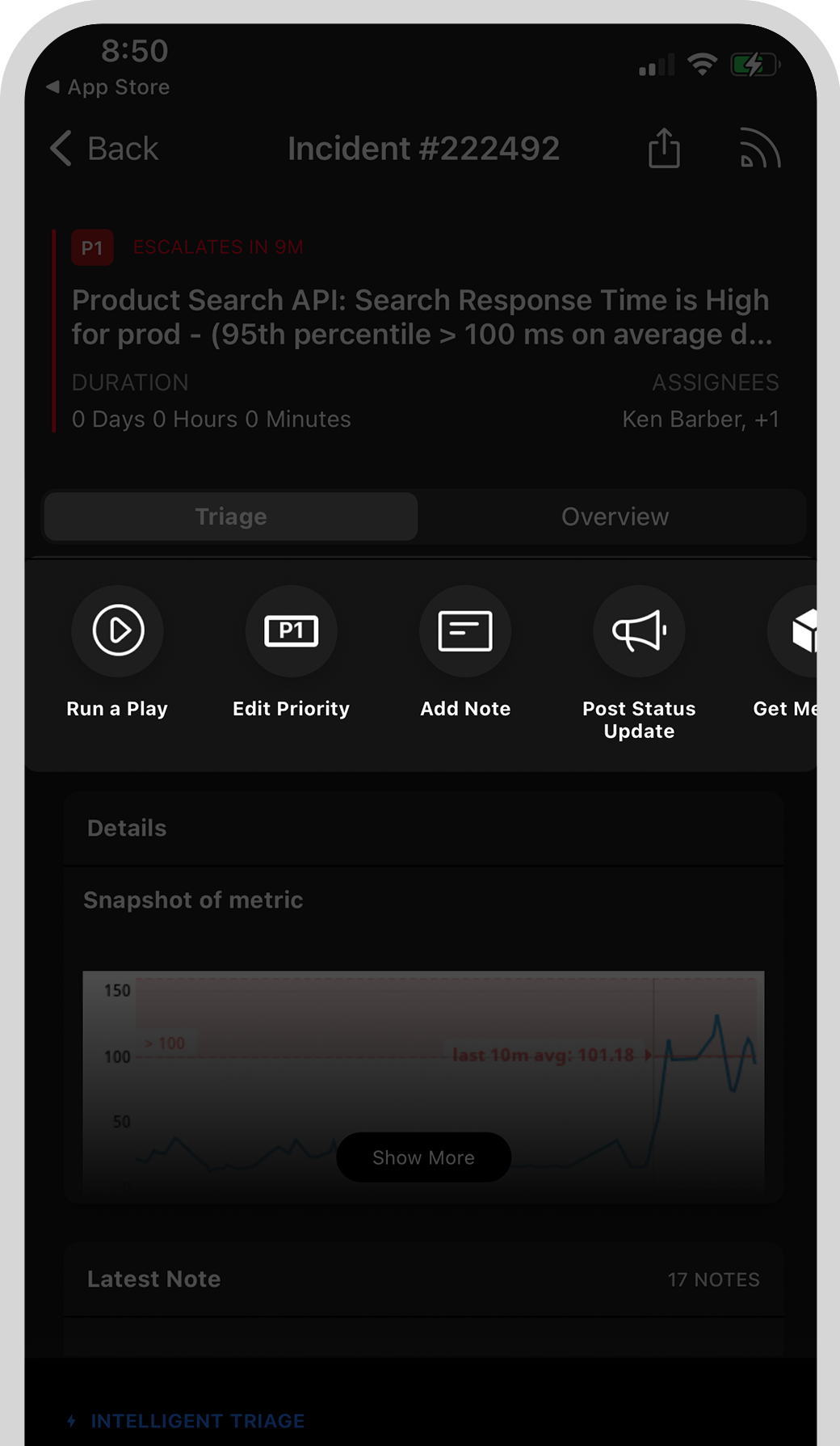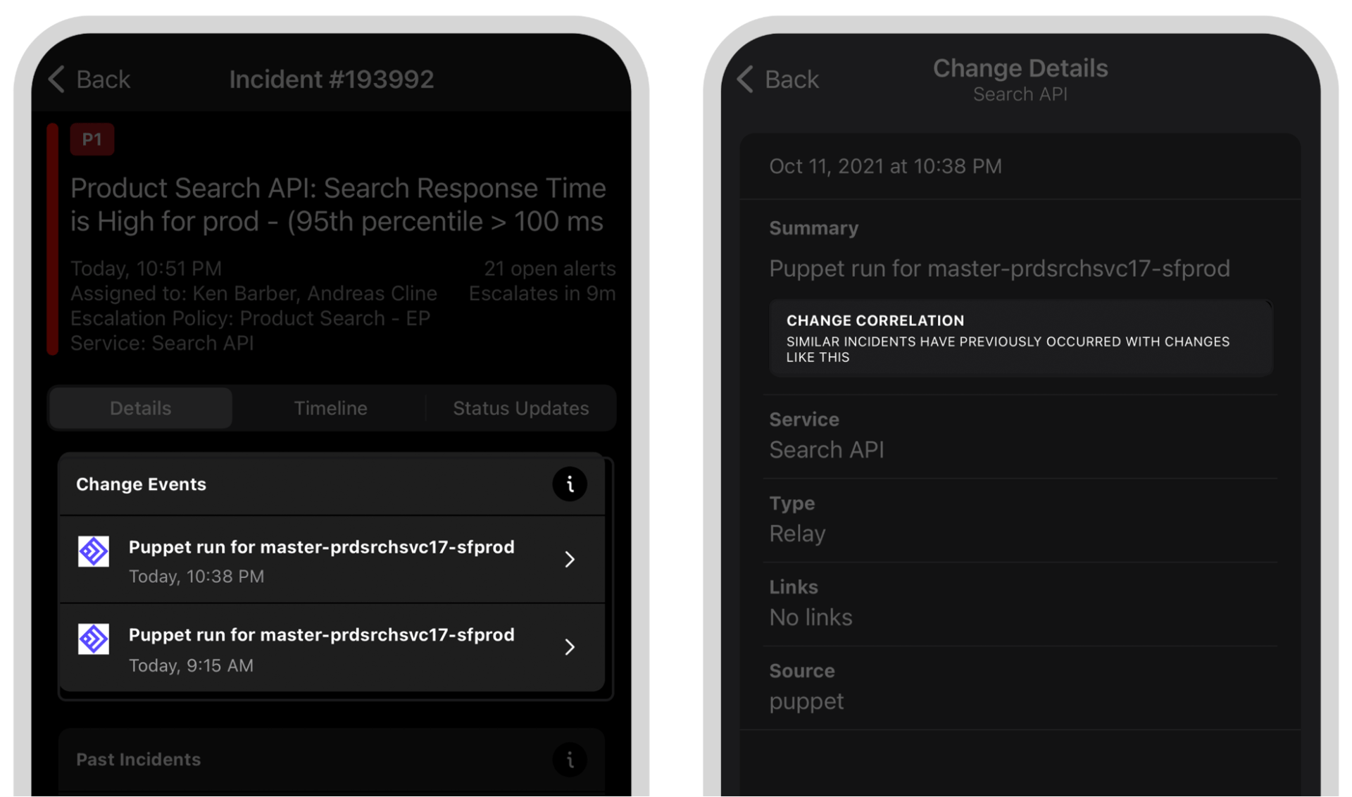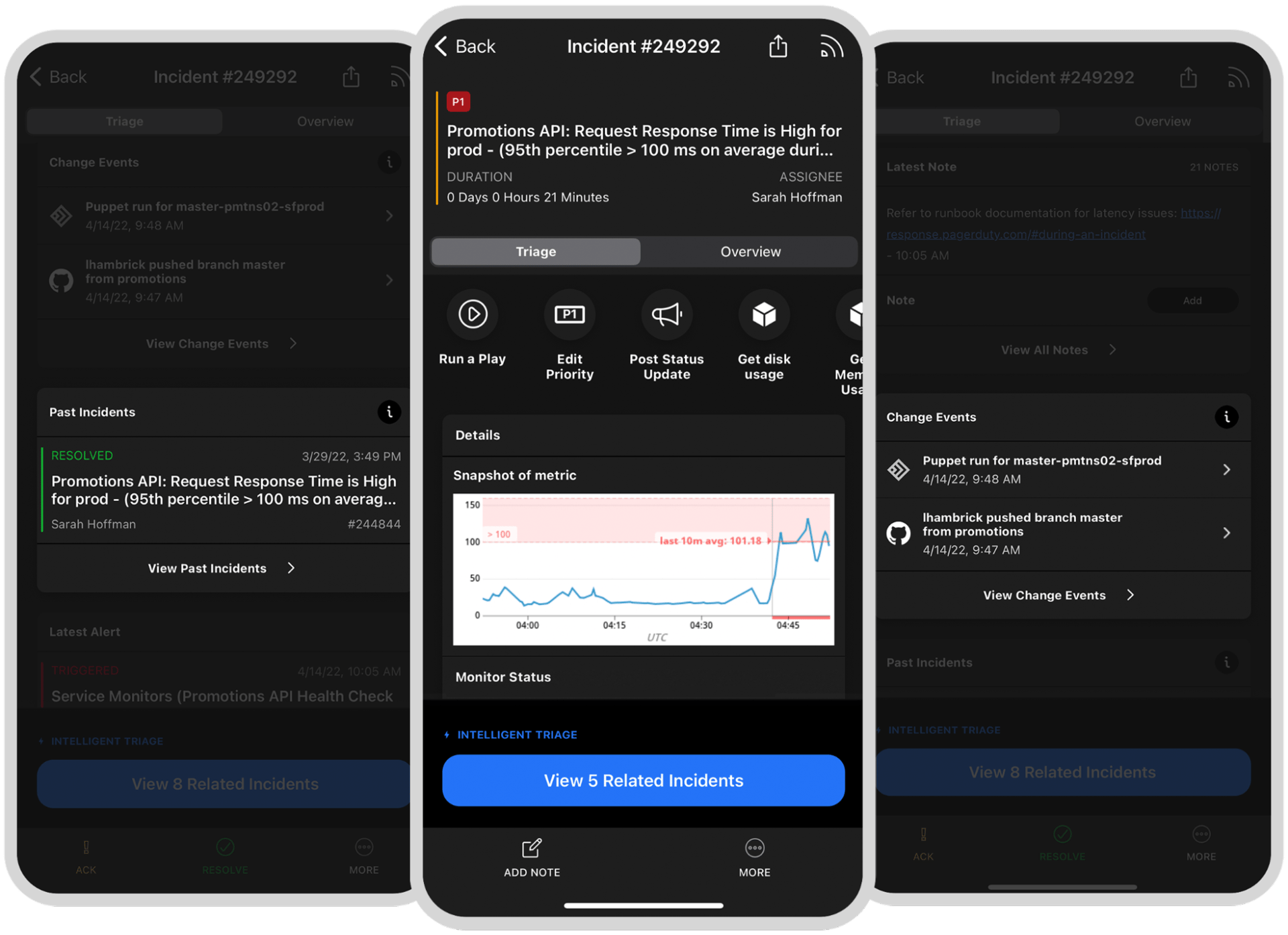 One way to do this is with the new mobile incident details screen. This screen provides you an easier visual experience and  access to all your most important features to help you address incident response faster. The most important information about an incident is available to you immediately, such as notes from other responders working on the incident, change events, past incidents, and the latest alerts.