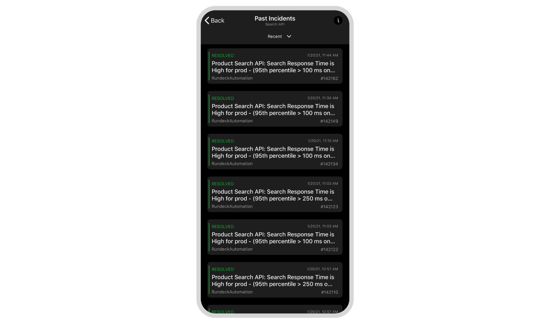 • The Past Incidents feature on the PagerDuty mobile app displays incidents with similar metadata that were generated on the same service as the current, active incident. This additional context facilitates accurate triage and reduces resolution time. For example, you can see whether you, or someone on your team, has been involved in a similar previous incident, and dive into details to discover what remediation steps were taken.