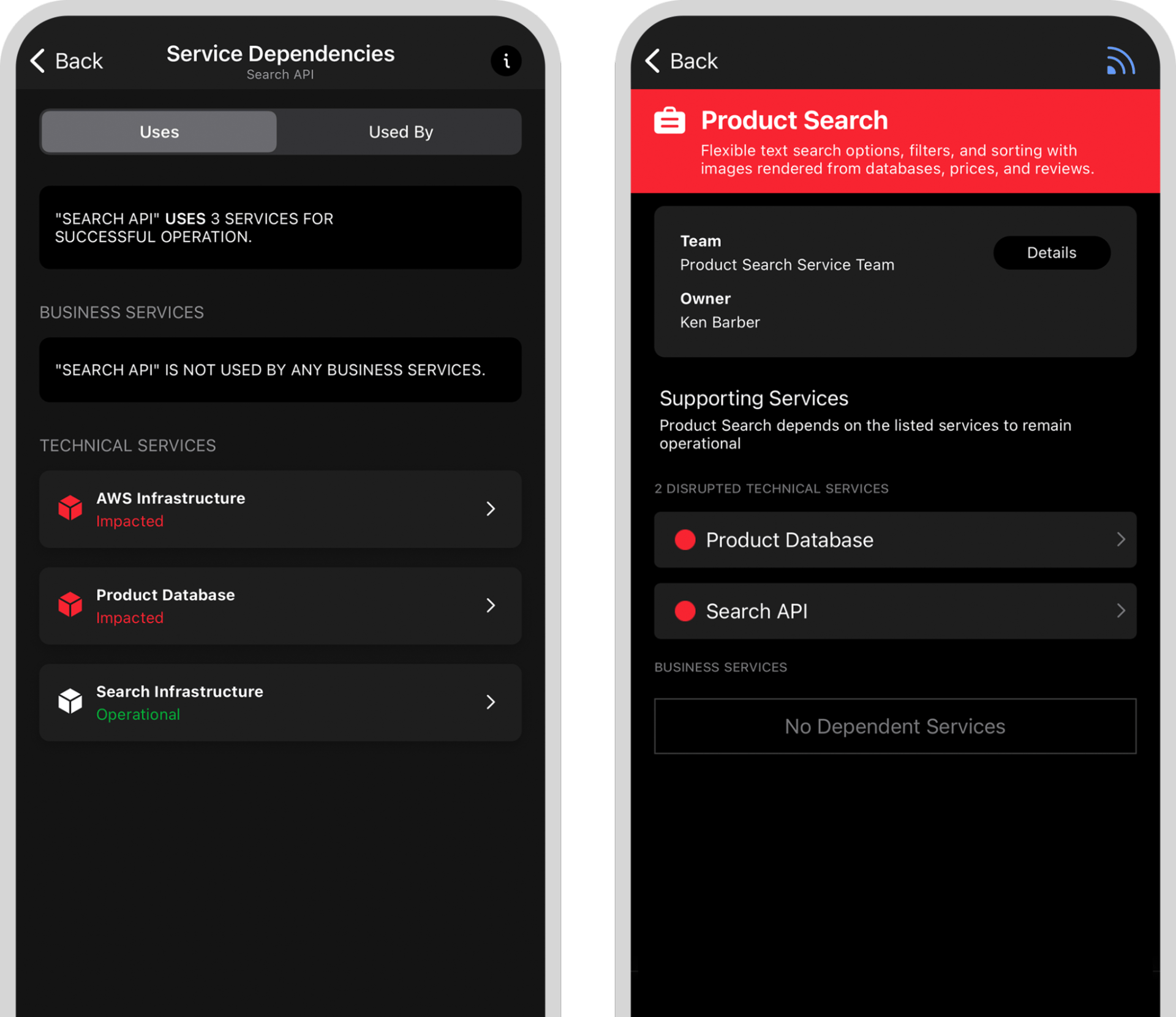 • Another important piece of information during incident response is understanding the impact radius of an issue. One way to glean this information is by understanding Service Dependencies. If a large, customer-facing business service is experiencing problems due to the technical service incident, you’ll need to respond faster and with more contextual intelligence to better understand the scope of the problem.With Service Dependencies in the mobile app, you can view what services are affected to better understand scope. Service Dependencies are listed within each particular service’s profile in the Service Directory.