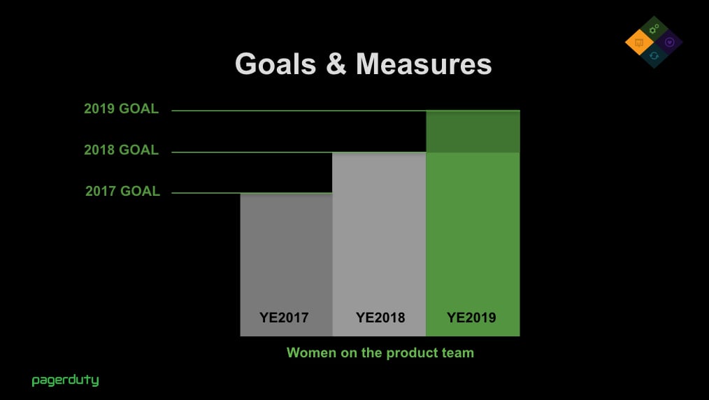As an example, before I started at PagerDuty, all of the leaders in the product team were men, and there were few women on the team. We made a concerted effort to improve the diversity of the team in general, with one of the focus areas bringing more women on the team. Each year we set a specific goal for percentage of women, measured it, reviewed progress on a quarterly basis, and hit it. These types of changes take time, and our numbers are not yet ultimately where we want to be—but as we continue to take advantage of programs put in place to feed a diverse pipeline of candidates, we hire in ratios that better reflect the population, and continuously improve our overall diversity.