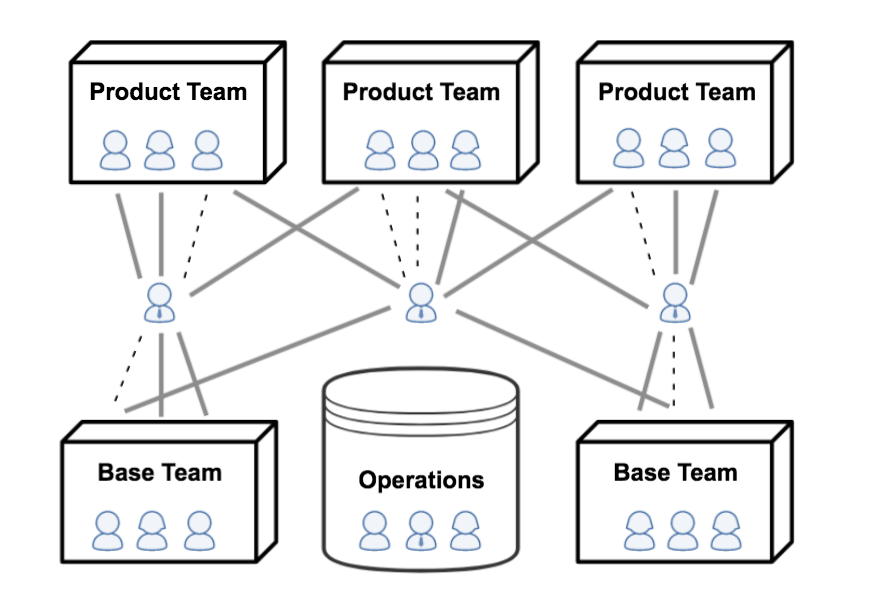 Given the less than ideal pace of progress made on the product in the prior year, the new teams were optimized for product delivery. To ensure that they could spend 100 percent of their time on cranking out new features, maintenance work was delegated to the Backend Services teams. These became known as “base teams” as they adopted Kanban methodology and took on ownership for all of the services in production, including all product on-call responsibilities. Furthermore, base teams fed into the product teams—engineers migrated from one to the other as product work ramped up.