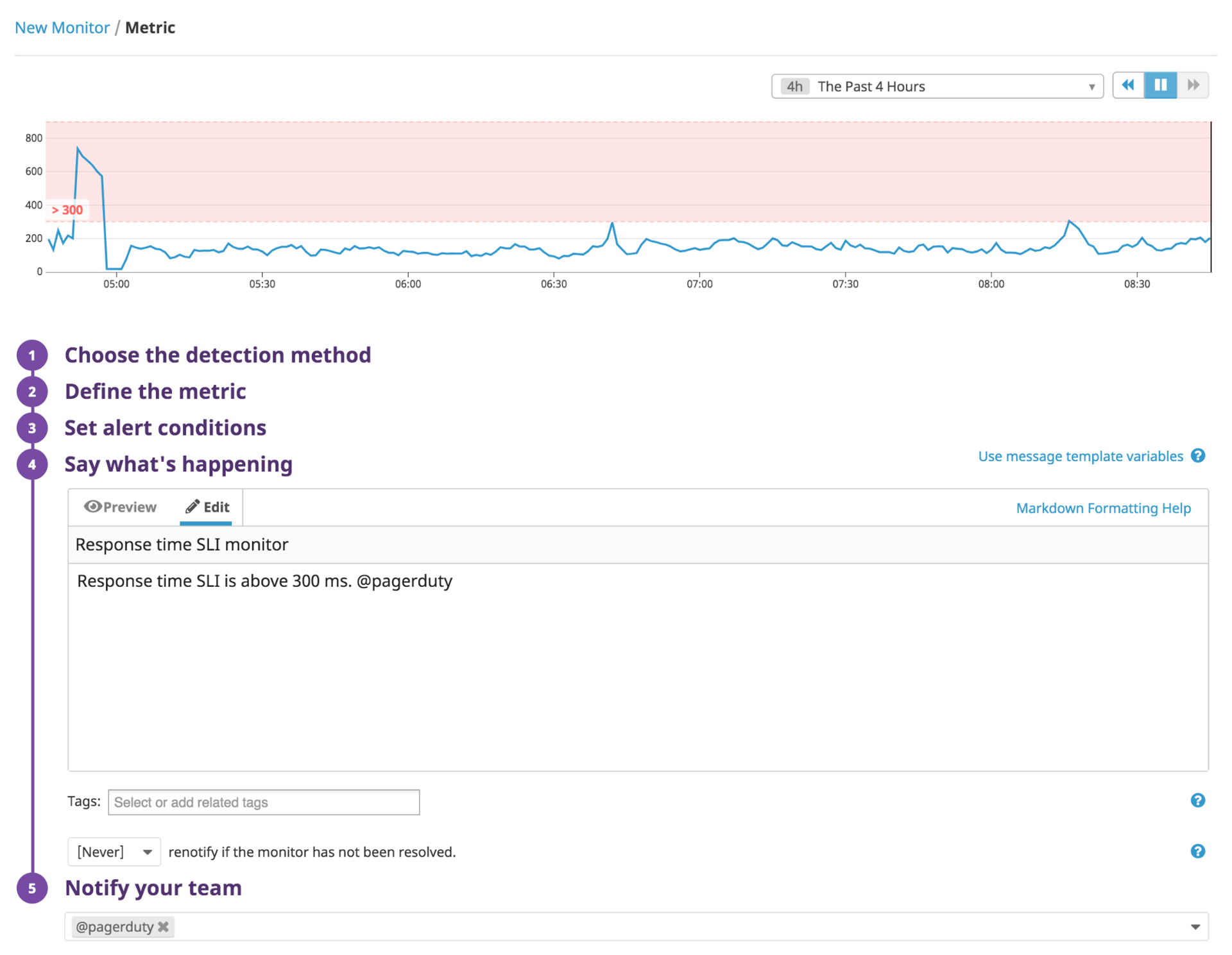 To reliably detect an incident and start your response quickly, you should automate the process of triggering an incident when an SLI crosses a threshold. When you integrate PagerDuty with Datadog, an alert in Datadog can immediately trigger an incident in PagerDuty, kicking off your team’s incident response process. To create an incident automatically, define an alert in Datadog based on an SLI, and @-mention PagerDuty in the body of the alert.