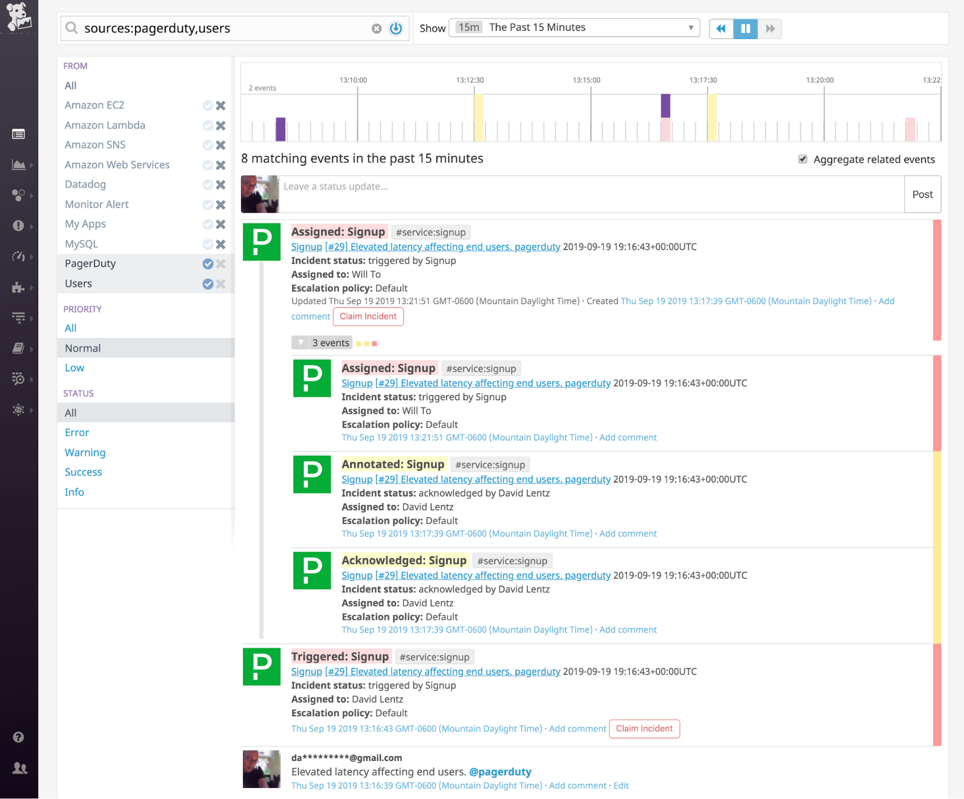 As your team updates an incident in PagerDuty—for example, to resolve the incident or to annotate it by adding a note in the **Notes** field in the PagerDuty UI—you can see those changes automatically appear in the Datadog event stream.