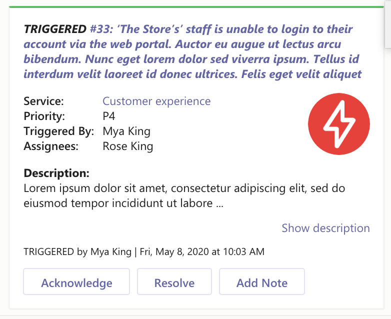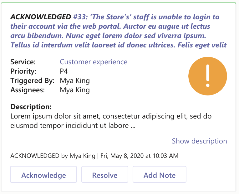 When an incident happens, responders are almost certainly in the middle of something—and often times that “something” is communicating with teammates via Microsoft Teams. The PagerDuty integration for Teams lets users acknowledge or resolve an incident directly from the Teams UI without having to do anything in PagerDuty—it’s all synced. You can also add notes on-the-fly from Teams to keep everyone up-to-date on the latest information.
