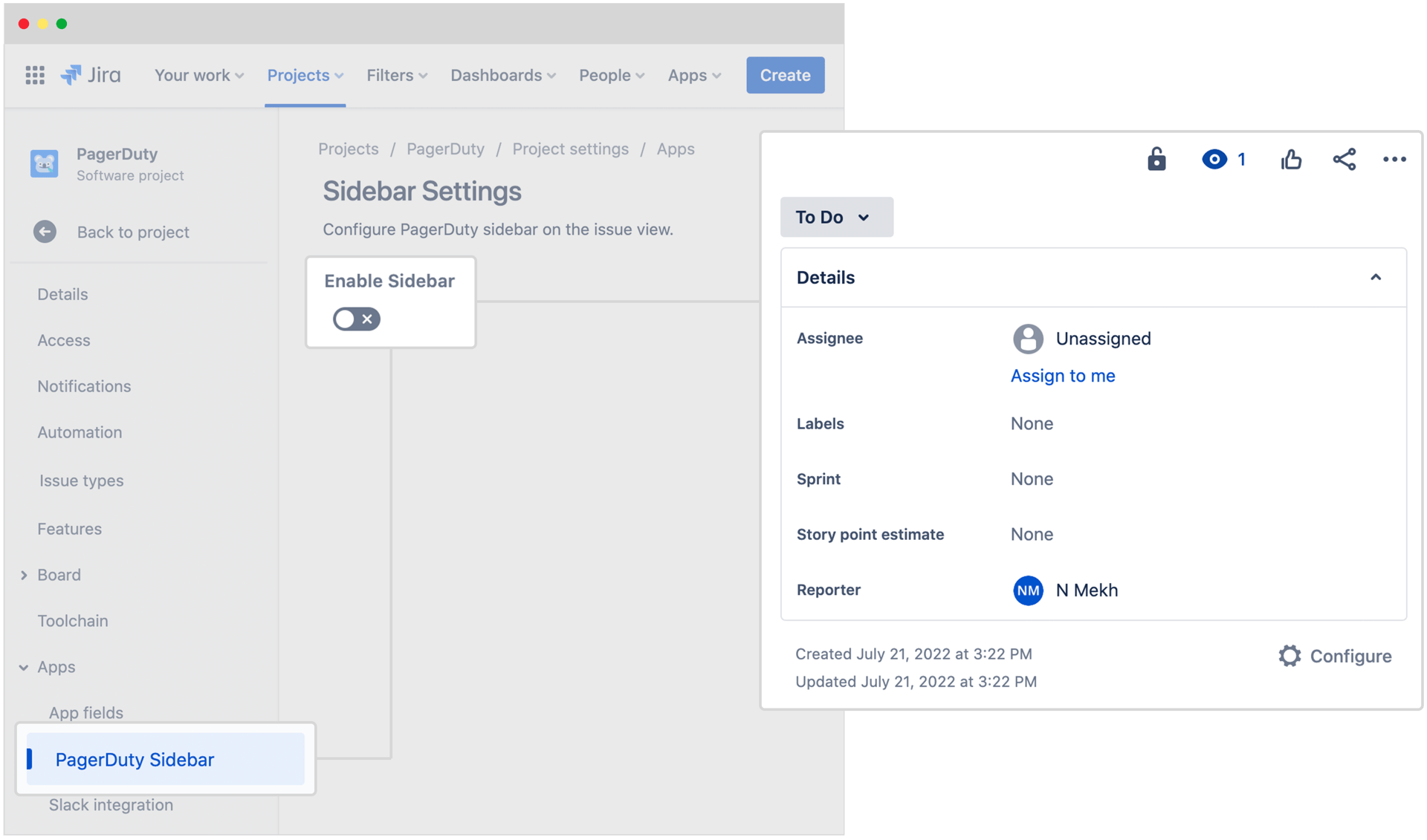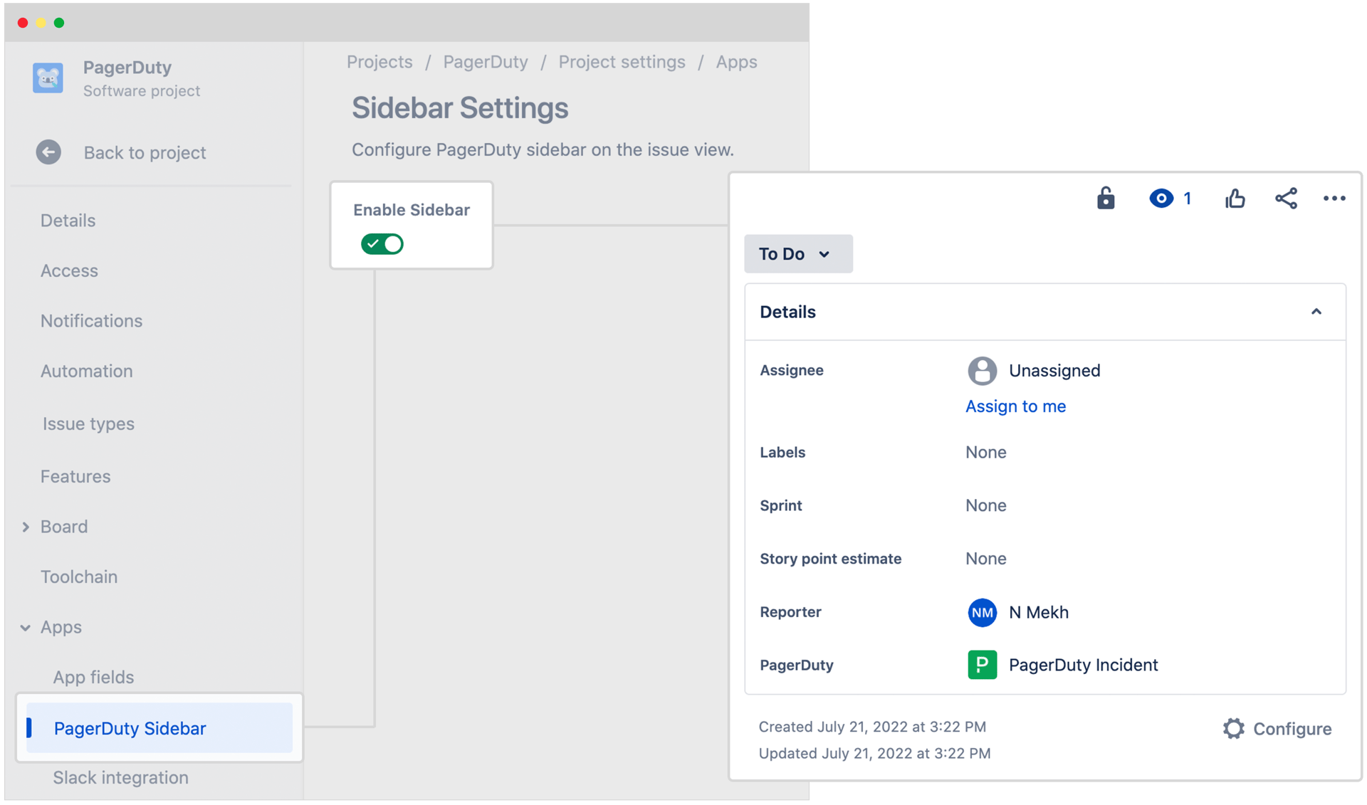 (Featured above: PagerDuty sidebar enabled in Jira Cloud)