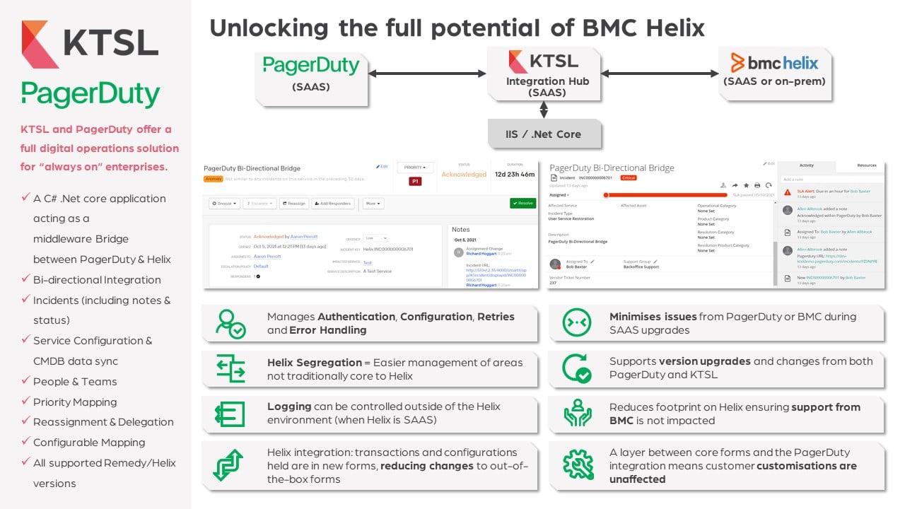 PagerDuty has transferred ownership of the BMC Helix/Remedy integration over to the BMC Elite partner known as KTSL-who specializes in service management and integration expertise. Going forward, KTSL will build and support the integration.