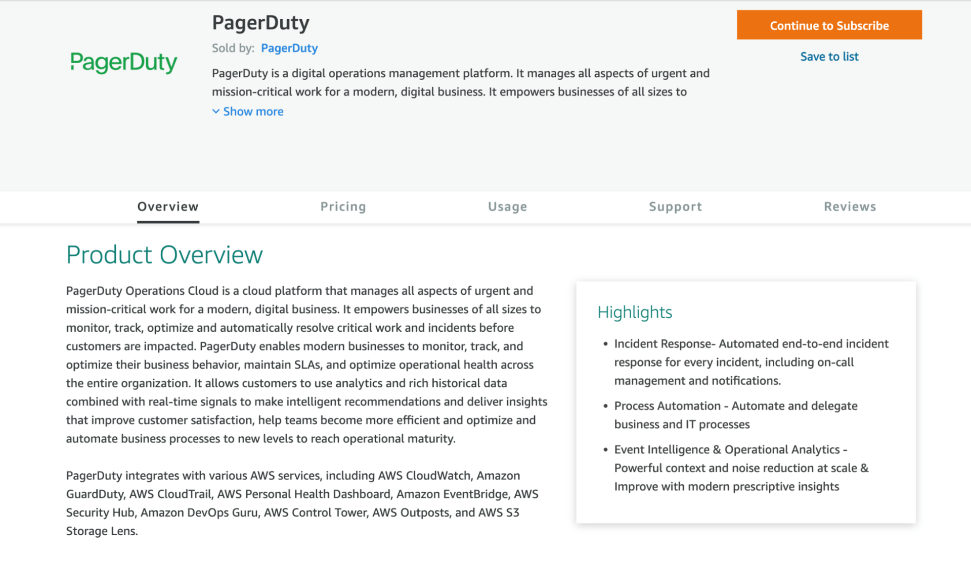 We are excited to announce that PagerDuty® Runbook Automation and PagerDuty® Process Automation On Prem are now available on the AWS Marketplace, the leading global cloud provider. With more than 200 different cloud services, AWS makes it simple and attractive to build and grow your cloud-native business and/or migrate your existing infrastructure to the cloud, so you can begin to take advantage of the unlimited scale, agility, and flexibility the cloud offers.