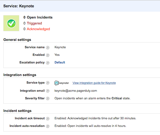 On the Keynote side, you simply need to log into your MyKeynote account and configure your alarms to send emails for both Warning and Critical issues to your PagerDuty-generated email address.