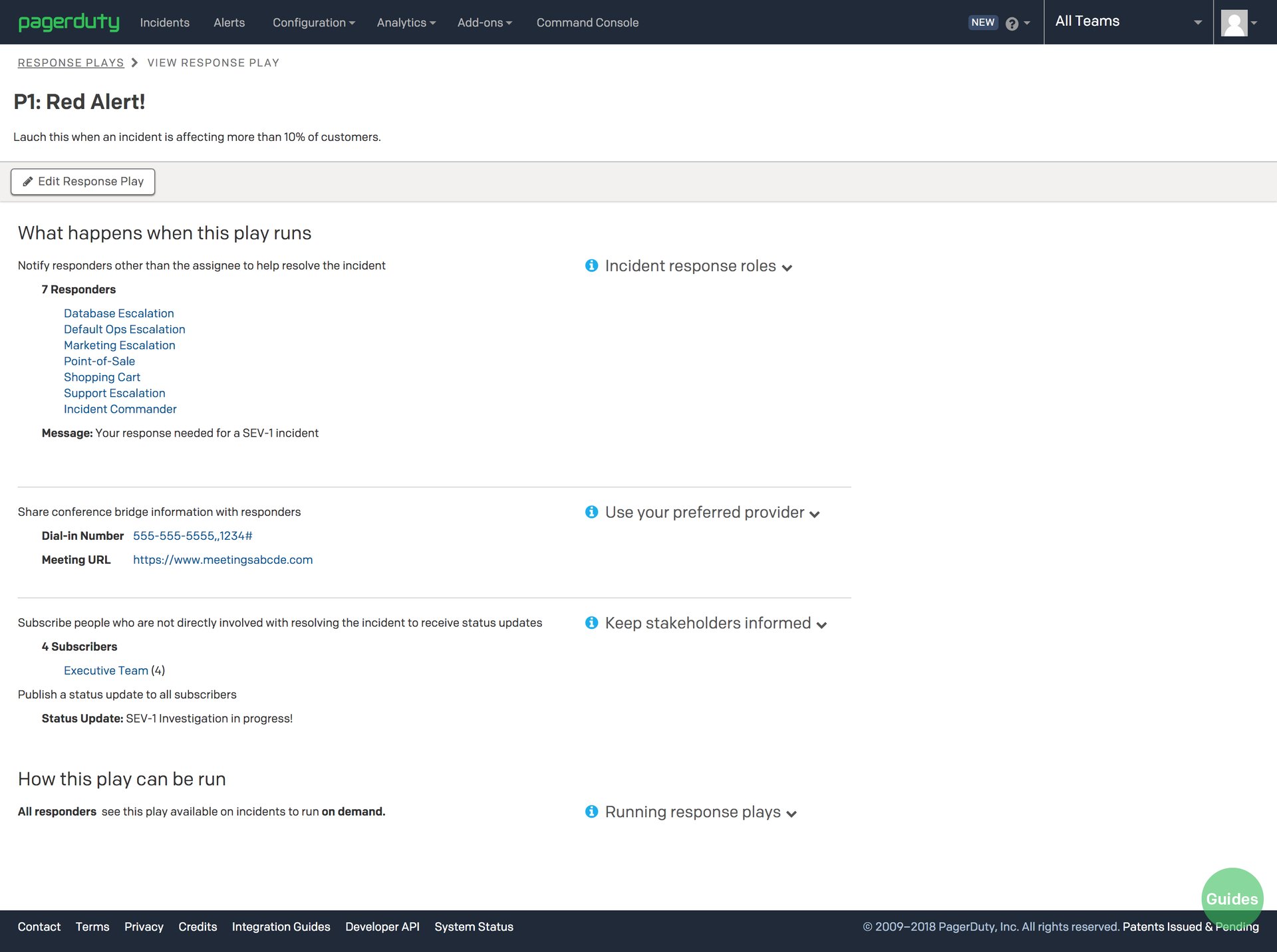 You may already be using PagerDuty’s Response Plays to mobilize a multi-team response and subscribe stakeholders to incident updates with a single click. Now you can also tie in a Response Bridge to your response plays so responders can seamlessly collaborate, enabling them to get down to the bottom of issues and restore your business’s critical services faster.
