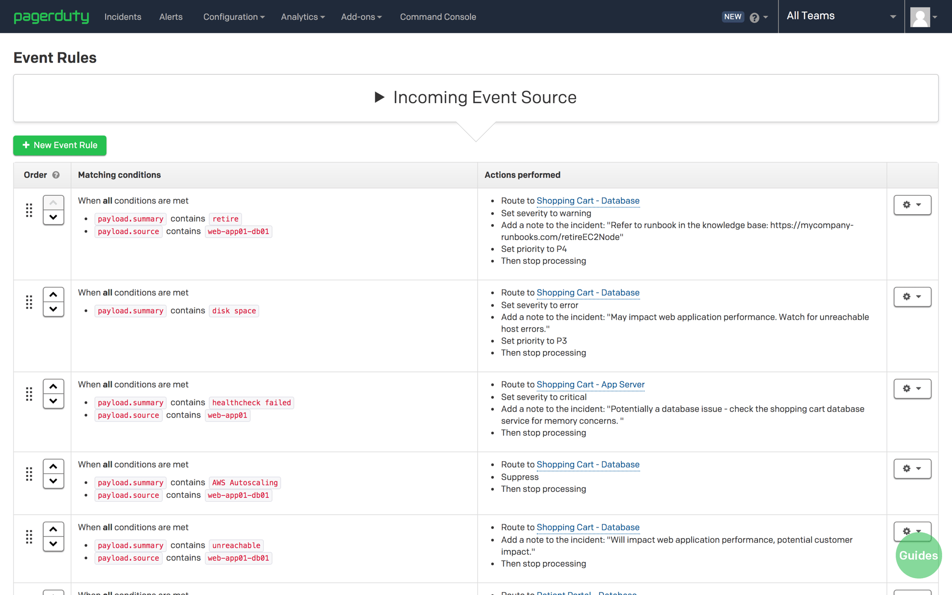 Event Rules, PagerDuty’s routing and workflow automation feature, helps you programmatically manage large volumes of event data from 200+ tools. You can intelligently automate routing, suppression, notification, and other behaviors based on event data, issue severity, support hours, and more.