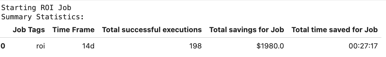 Each individual job may have its own metric or metrics. For this example let’s assume the job saves 10 minutes of toil for a mid-level DevOps team member, equating to $10 per execution.