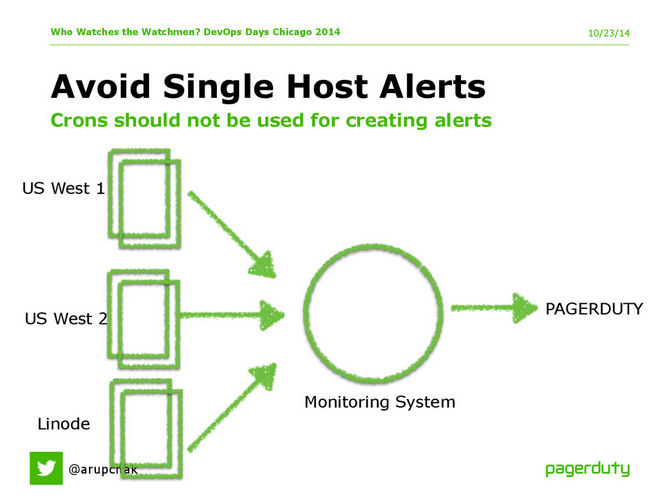 “Assume that anything that’s running on a single box is brittle and will break at the most inopportune time,” says Chakrabarti. Rather, PagerDuty sets up alerts on cluster-level metrics, such as the overall number of 500 errors, not the number in a single log file, and overall latency, not one box’s latency. For this reason, PagerDuty tries to funnel all of their systems through the monitoring system rather than feeding data directly from the servers or services into PagerDuty.