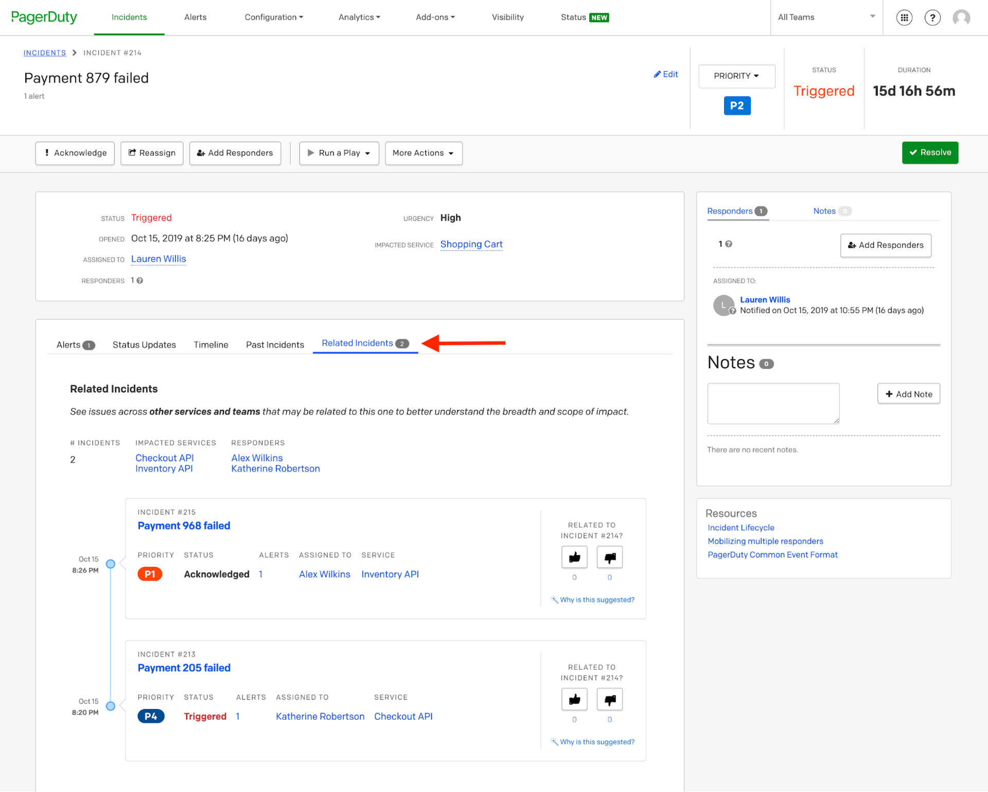 With our newly launched Related Incidents feature, users gain real-time visibility into their critical apps and services, all in one place. Related Incidents is powered by machine learning and shows you what incidents are happening right now on other services. This feature uses Event Intelligence to help responders establish a reduced triage time for incidents that impact multiple teams. It also reduces duplicated communications and ensures responders understand the entire scope of an outage and don’t interfere with one another while trying to solve problems. With Related Incidents, responders can: