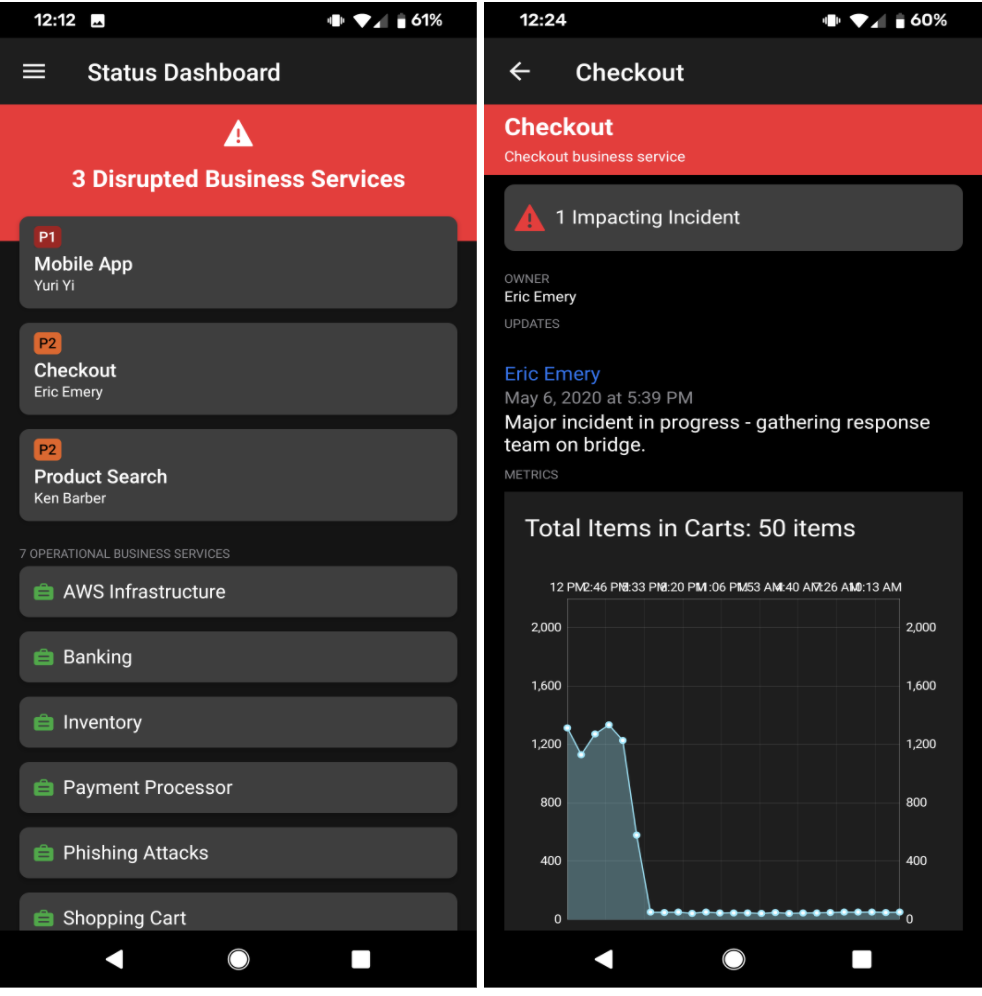 The Mobile Status Page keeps your non-technical business users informed about the status of critical outages so that all business stakeholders can view the active state of key business services in the mobile app, regardless of their access level. This feature is available on most iOS and Android devices.