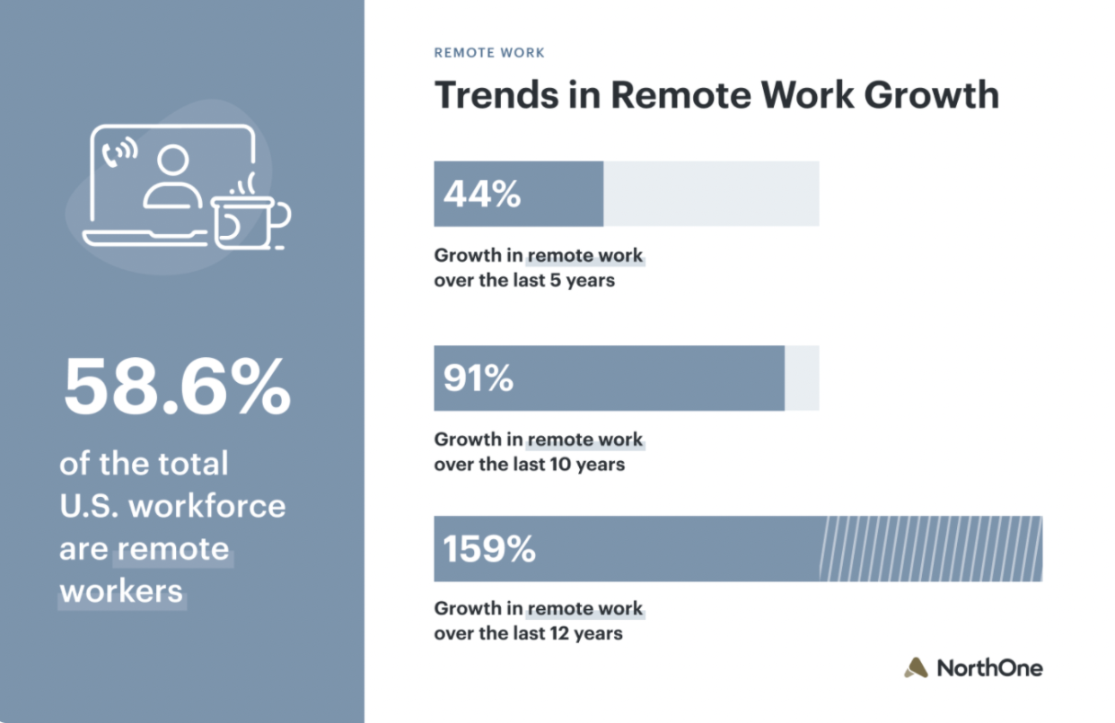 Die Art und Weise, wie wir Kontakte knüpfen, lernen, einkaufen und Pflege erhalten, hat sich in den letzten 18 Monaten drastisch verändert. Für viele von uns war die Art und Weise, wie wir arbeiten, vielleicht eine der drastischsten Veränderungen. Während Homeoffice vor der Pandemie eine Option war, NCCI-Staaten , „nur 6 % der Beschäftigten arbeiteten hauptsächlich von zu Hause aus und etwa drei Viertel der Arbeitnehmer hatten noch nie von zu Hause aus gearbeitet.“ Schneller Vorlauf ins Jahr 2021, und laut NorthOne , hier sehen Sie, wie viel sich geändert hat: