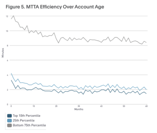 Dennoch müssen Teams auf alles vorbereitet sein. Mobile Anwendungen helfen ihnen, schneller auf Störungen zu reagieren. So kann ein Techniker beispielsweise beim Gassigehen mit dem Hund einen Vorfall melden. In einem Bericht Basierend auf unseren eigenen Plattformdaten haben wir uns angesehen, wie die Teams im Jahr 2020 im Vergleich zu 2019 abgeschnitten haben. Laut unseren Daten Wir haben festgestellt, dass Unternehmen mit einer höheren mobilen Akzeptanzrate eine um 40–50 % schnellere MTTA (mittlere Zeit bis zur Bestätigung) hatten. als solche mit geringerer mobiler Nutzung. Dieser Vorteil nimmt mit zunehmender Größe einer Organisation oder eines Kontos weiter zu.
