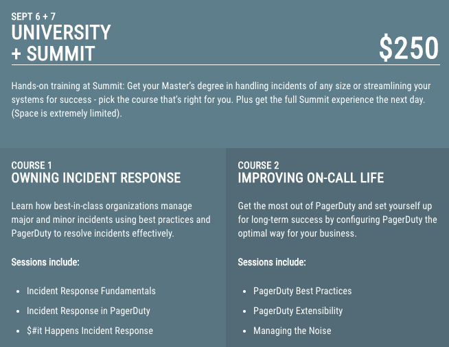 All of this inner dialog drove us to the conclusion that we needed to have more focus on training our community how to operate as effectively as possible and how to leverage PagerDuty most effectively for their use case. So we’re launching the PagerDuty University at PagerDuty Summit this year with a goal to share our experience and what our thousands of customers have taught us with the broader community.