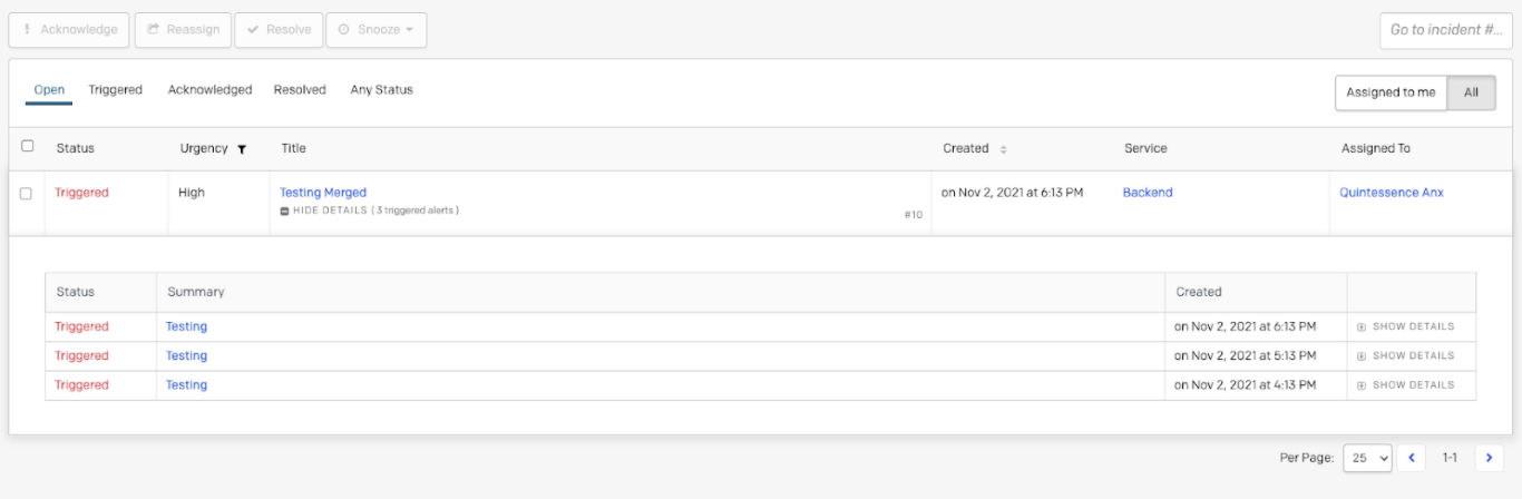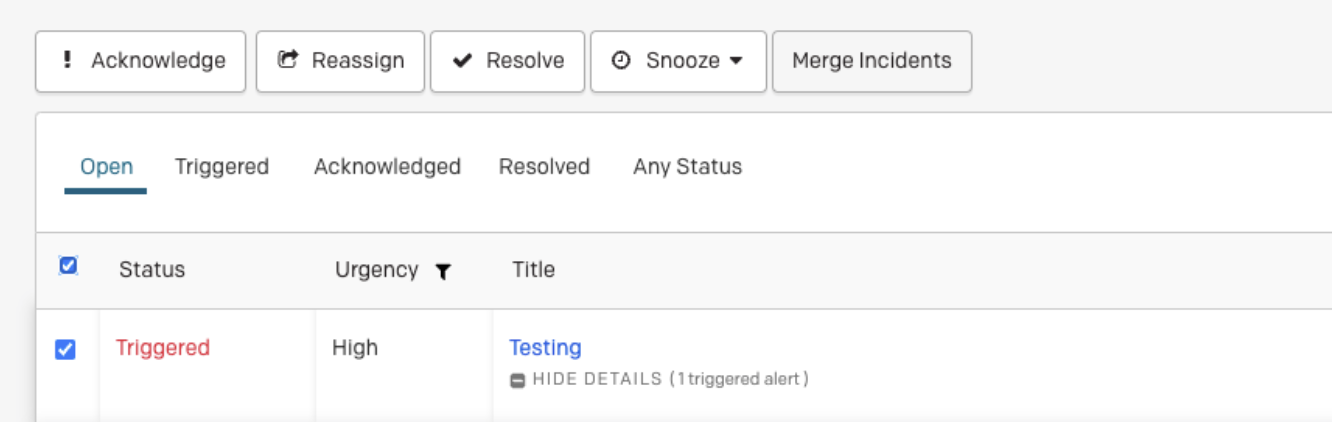 Es gibt mehrere Möglichkeiten, Vorfälle zusammenzuführen. Eine davon ist, dass nach Auswahl eines oder mehrerer Vorfälle in der PagerDuty Benutzeroberfläche die Schaltfläche „Vorfälle zusammenführen“ erscheint.