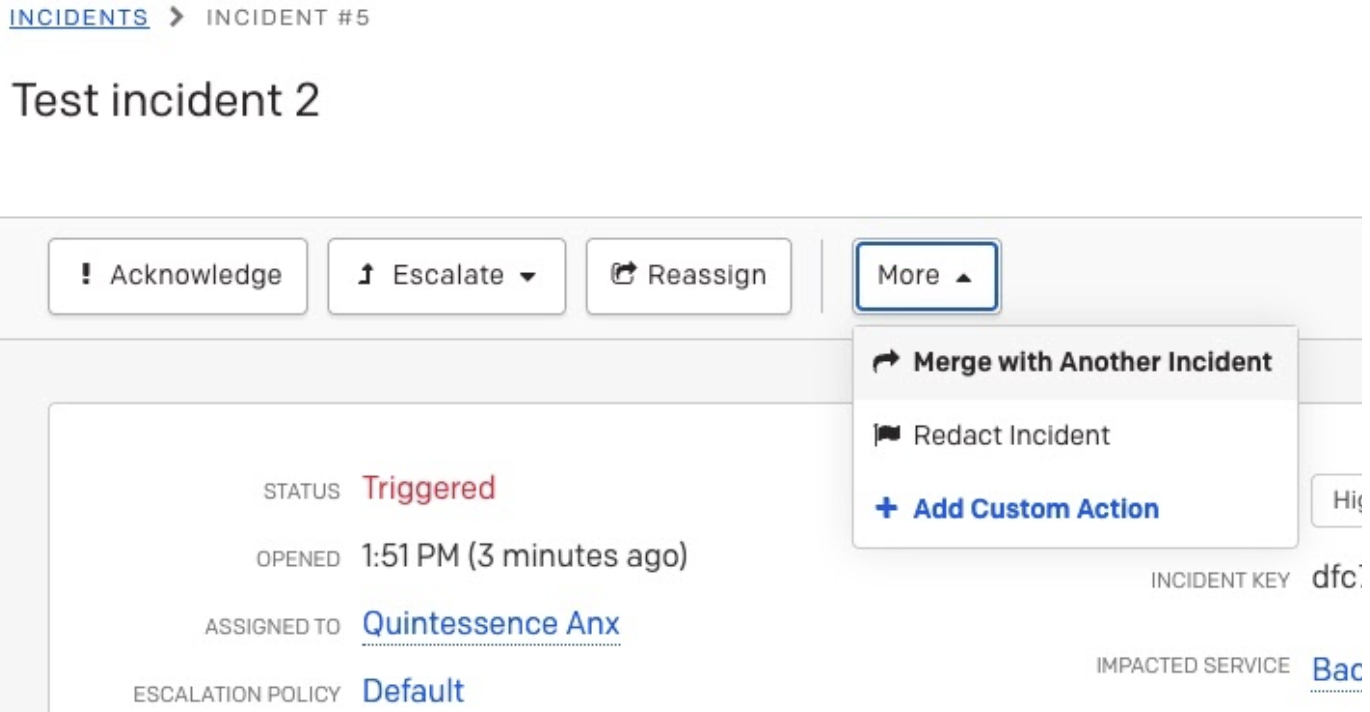 Die andere Möglichkeit zum Zusammenführen von Vorfällen besteht darin, den Vorfall zu öffnen und die Option „Mit einem anderen Vorfall zusammenführen“ aus dem Dropdown-Menü „Mehr“ auszuwählen: