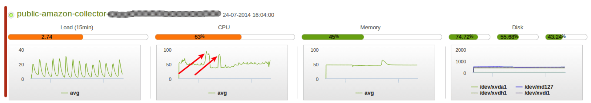 Das obige Dashboard zeigt, dass unser Server aufgrund von Systemwartungsarbeiten eine CPU-Überlastung aufwies. Sollte diese CPU-Überlastung Ihre Kunden beeinträchtigen, benachrichtigen Sie bitte Ihren Bereitschaftstechniker, damit dieser die Probleme behebt. Nutzen Sie Ihre Daten optimal durch die Integration von [fehlende Information]. PagerDuty und Logtrust Heute.