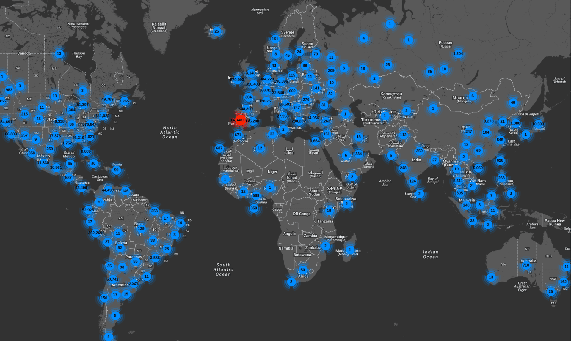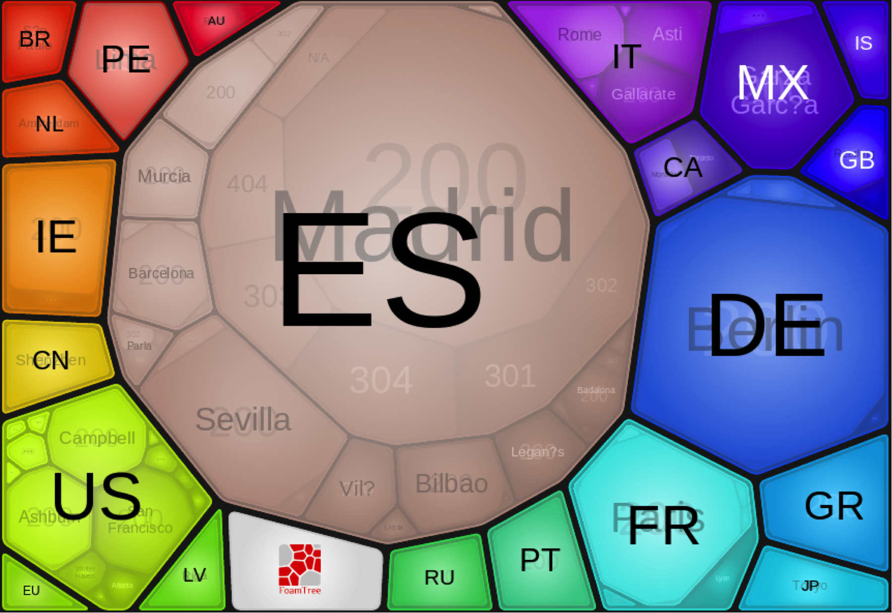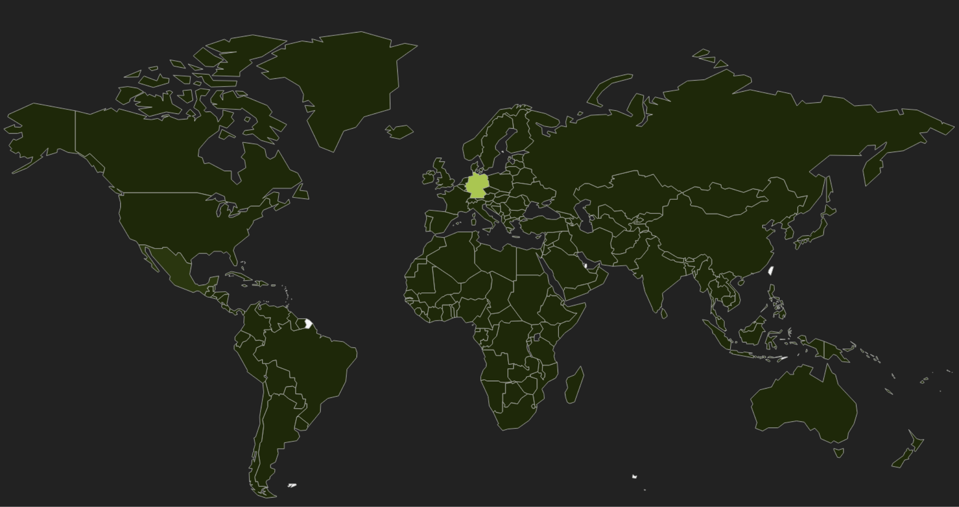 Manche von uns lernen visuell, daher eignen sich Diagramme gut, um Problembereiche schnell zu identifizieren. Stellen wir uns vor, wir betreiben eine Website und möchten wissen, wann der Dienst nicht ordnungsgemäß funktioniert. Zunächst sollten wir prüfen, wie viele Anfragen gesendet werden und wie viele davon Fehler enthalten. Mithilfe einer Karte lässt sich feststellen, ob Probleme in einem bestimmten Land oder weltweit auftreten. Unten sehen Sie beispielsweise eine Karte zur Anfrageverteilung: