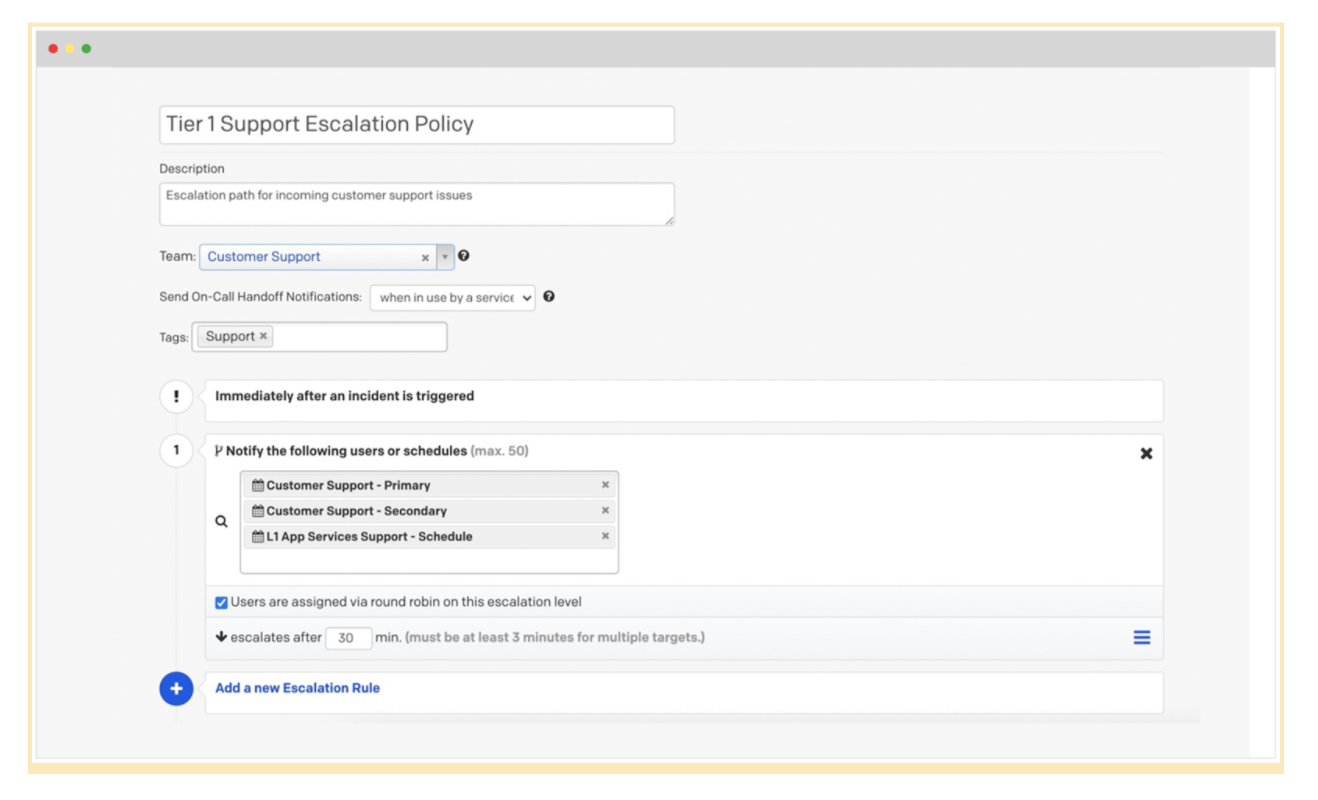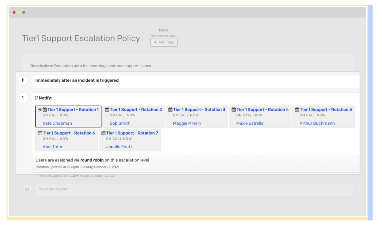 Die Round-Robin-Planung stellt sicher, dass jeder neue Vorfall der nächsten Person zugewiesen wird, sowohl Managern als auch Benutzern, sodass die Teams die Verantwortlichkeiten besser verteilen können. Dies trägt dazu bei, die Rotationen für alle im Bereitschaftsplan fair und vorhersehbar zu gestalten, einschließlich der höheren Eskalationsebenen wie Direktoren, die bei einem Vorfall mit hoher Priorität eingreifen müssen.