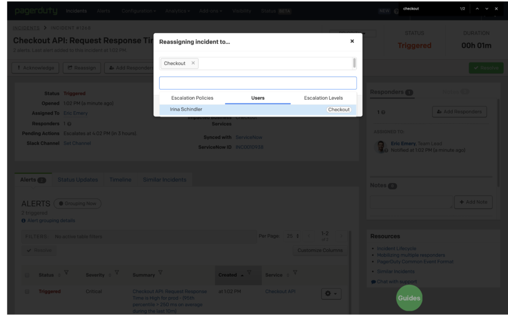 Sie können genau sehen, wer sich um einen Vorfall kümmert, und über die App zusätzliche Ansprechpartner (Benutzer oder Eskalationsrichtlinien) hinzufügen, um sicherzustellen, dass Sie die Hilfe erhalten, die Sie benötigen, um Probleme schneller zu lösen.